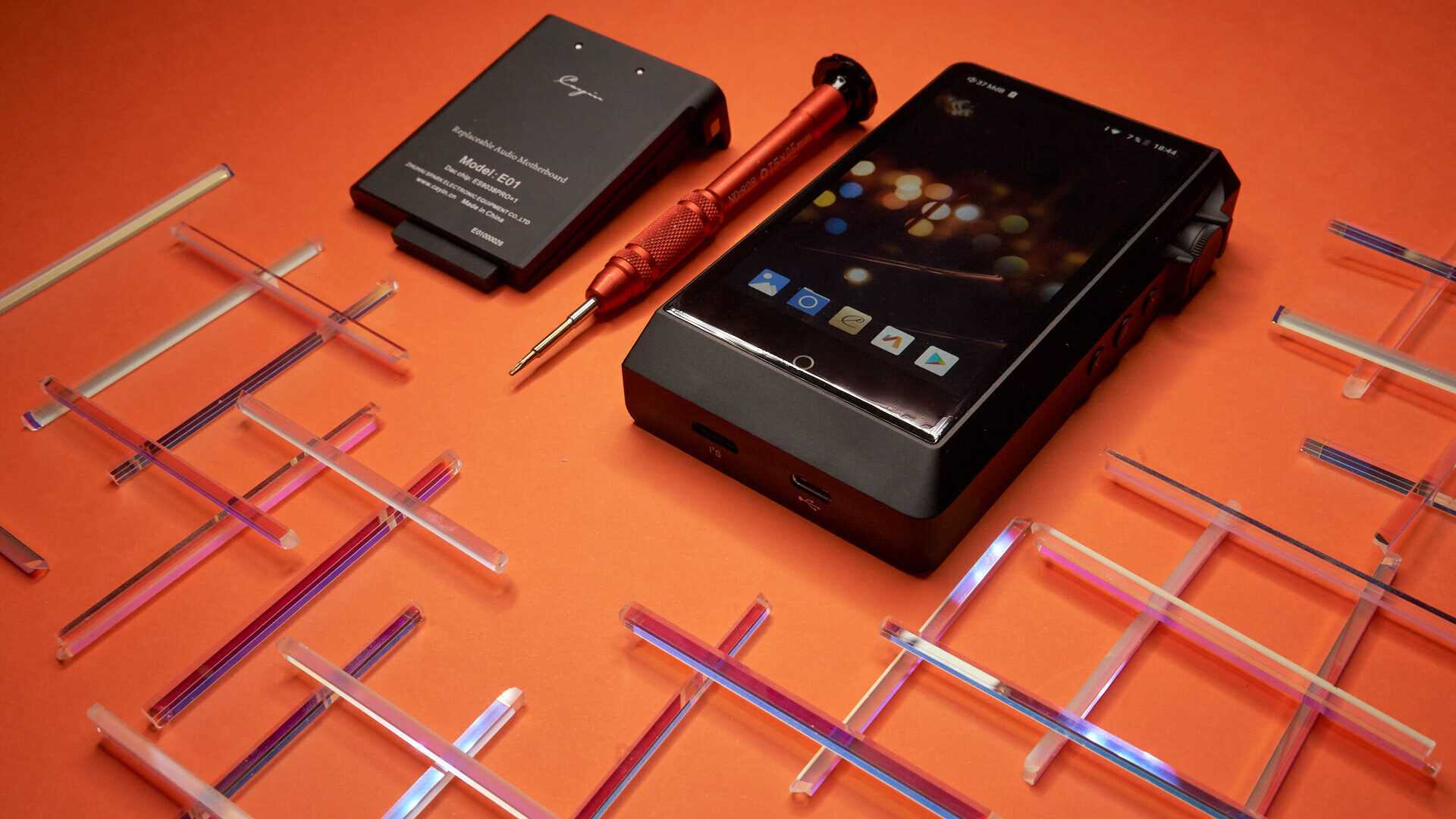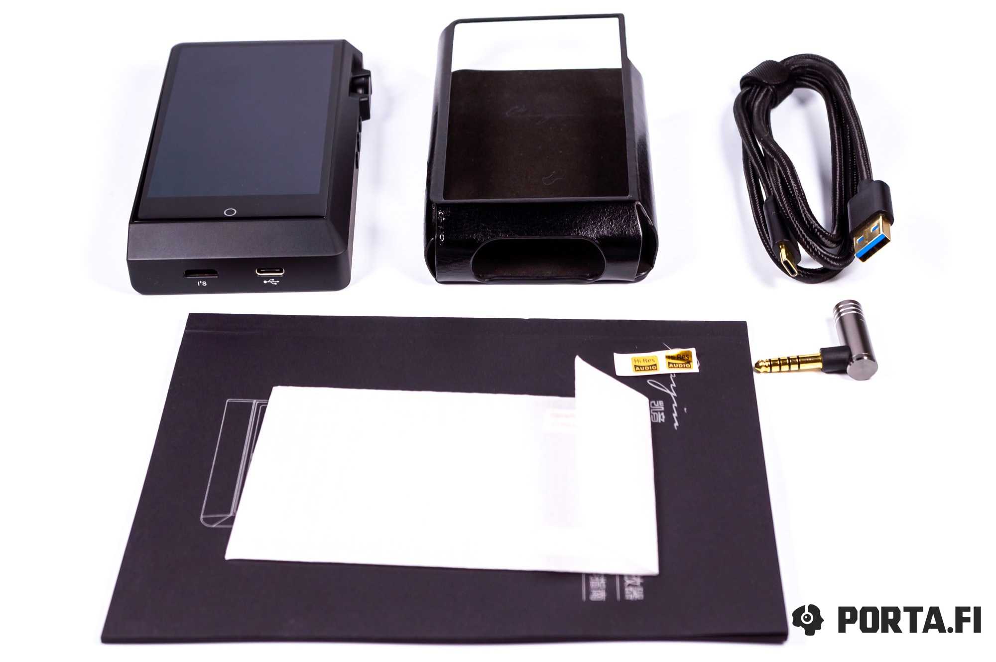 Помимо него в коробке поместился конверт из крафт-бумаги с инструкцией, пленками на экран и нелепой наклейкой в виде гитары, а также кабель microUSB-USB, переходник 3,5мм-RCA для подключения к коаксиальному выходу, брелок в стиле Cayin и картридер для microSD. Китайцы попытались сделать красиво, но дешевенький брелок, убогонький картридер, безвкусная наклейка в виде гитары и разводы на перламутровой краске коробки премиальности никак не добавляют.