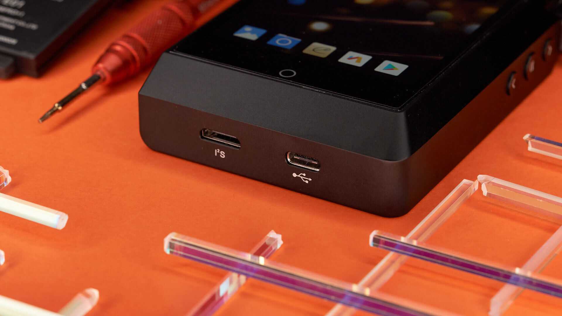 Разумеется, по разным сторонам плеера разместилась большая часть его аппаратных интерфейсов. Расположение довольно стандартно. Справа находятся три кнопки управления воспроизведением и регулятор громкости, совмещённый с клавишей включения, энкодер качественный, так что сила вращения правильная, а фиксация щелчков — корректная. Слева расположен слот карт памяти, у плеера есть и встроенный накопитель, но, как известно, свободного места много не бывает. Снизу поместили два выхода: традиционный USB-C и I2S, сделанный по стандарту Mini-HDMI. Последний будет наиболее удобен обладателям стационарных ЦАПов Cayin. Разъём USB тоже не так прост, помимо стандартных функций вроде зарядки и доступа к памяти, он позволяет подключать USB OTG диски, использовать плеер в роли внешнего ЦАПа, а так же выводить цифровой сигнал на внешние устройства по USB Audio или (с использование специального переходника) по S/PDIF.