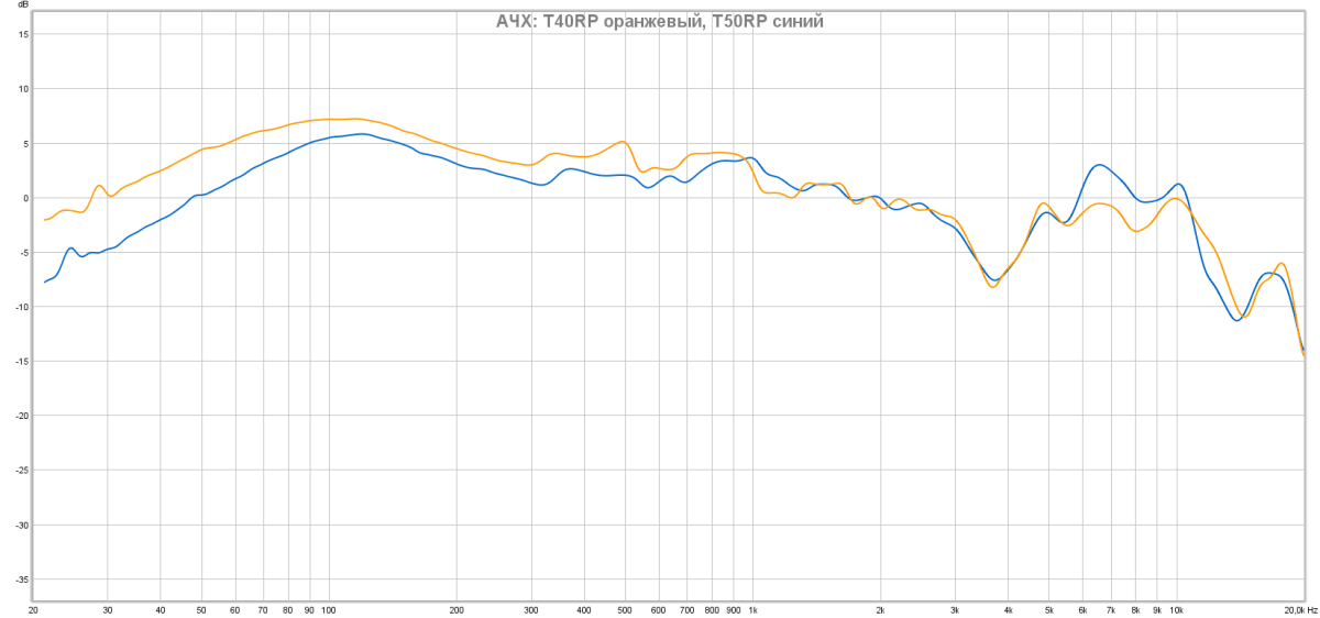 Модель T50RP демонстрирует более линейную АЧХ в области 200-2000 Гц, что делает звучание более светлым. Басовая область имеет аналогичный подъем в области 100 Гц, но спад отдачи с понижением частоты происходит раньше. Пик в районе 6 кГц ответственен за ощущение более высокой детальности. Поведение обоих наушников в зоне выше 10 кГц фактически идентично.