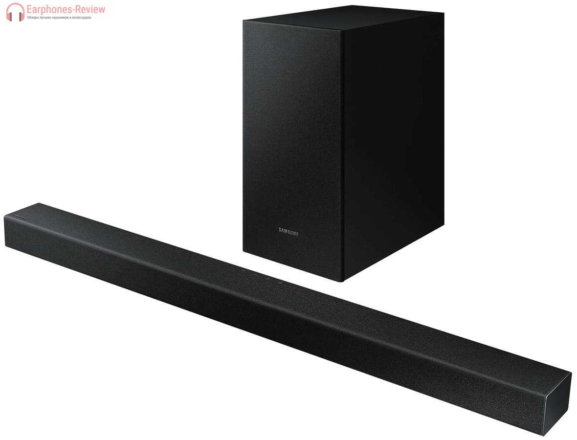 Samsung HW-A430 – недорогая, но функциональная система 2.1. Она исполнена в классическом черном цвете, включает звуковую панель с 2 динамиками и отдельно стоящий сабвуфер в фазоинверторном корпусе. При желании звуковую панель можно повесить на стену.