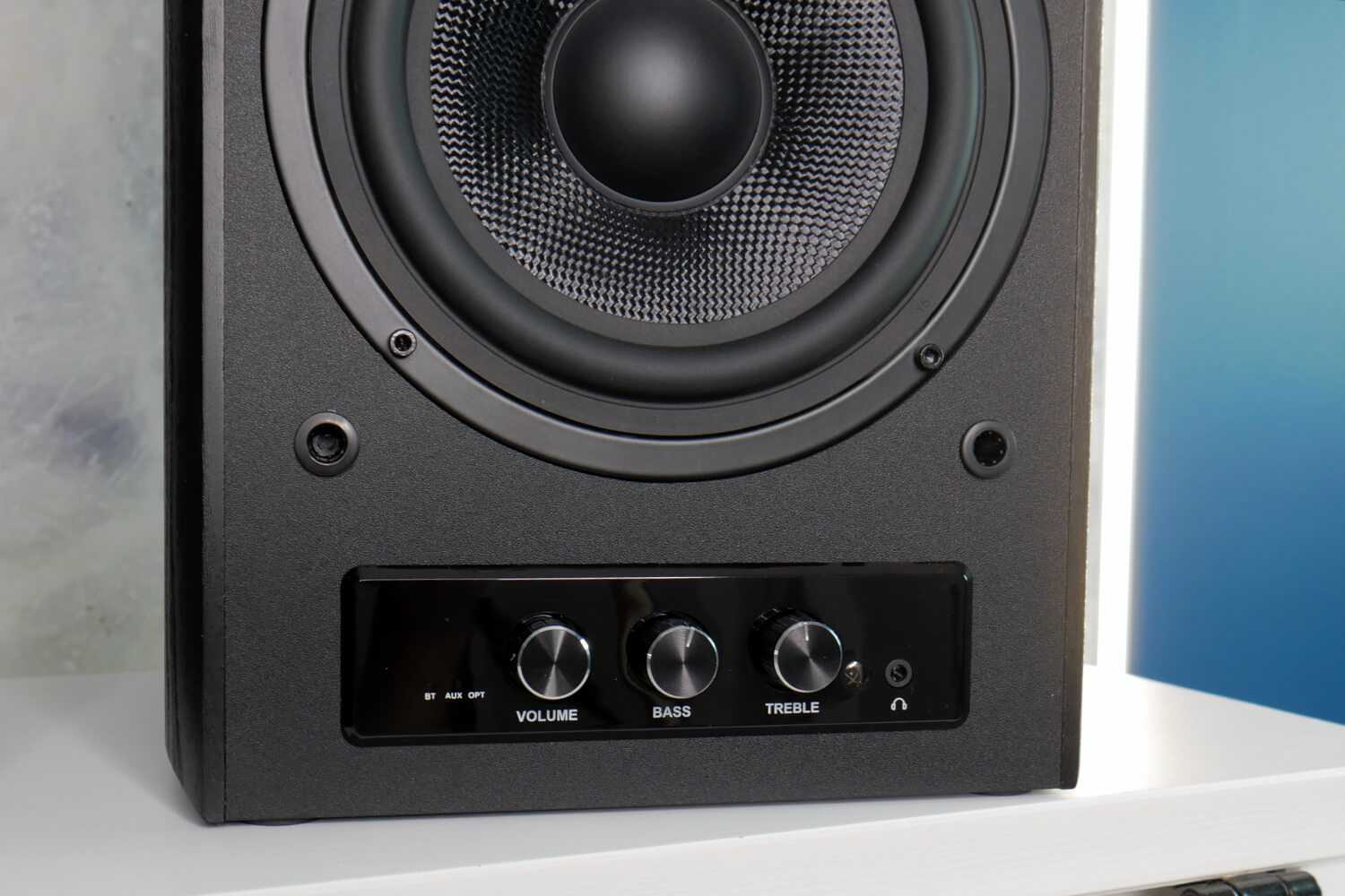 Лицевая панель активной колонки содержит регуляторы громкости без ограничений по углу вращения. Длительное нажатие применяется для запуска режима ожидания. Короткое — для переключения входов.