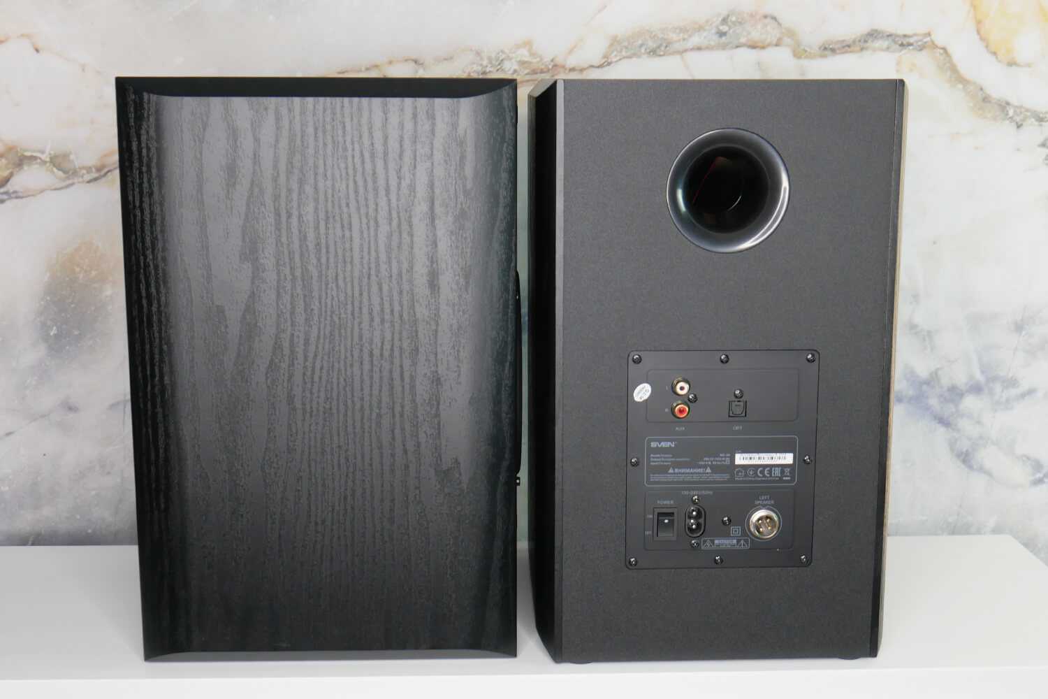 Можно добавить, что колонки Sven MC-30 – фазоинверторного типа, и фазоинверторы расположены сзади, поэтому устанавливать их стоит не ближе чем в 15-20 см от стены. К качеству сборки претензий нет: трещин, клеевых подтёков, царапин и потёртостей не заметил. Внутри тоже ничего не шумит при перестановке.