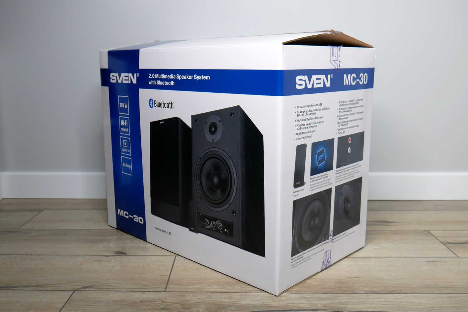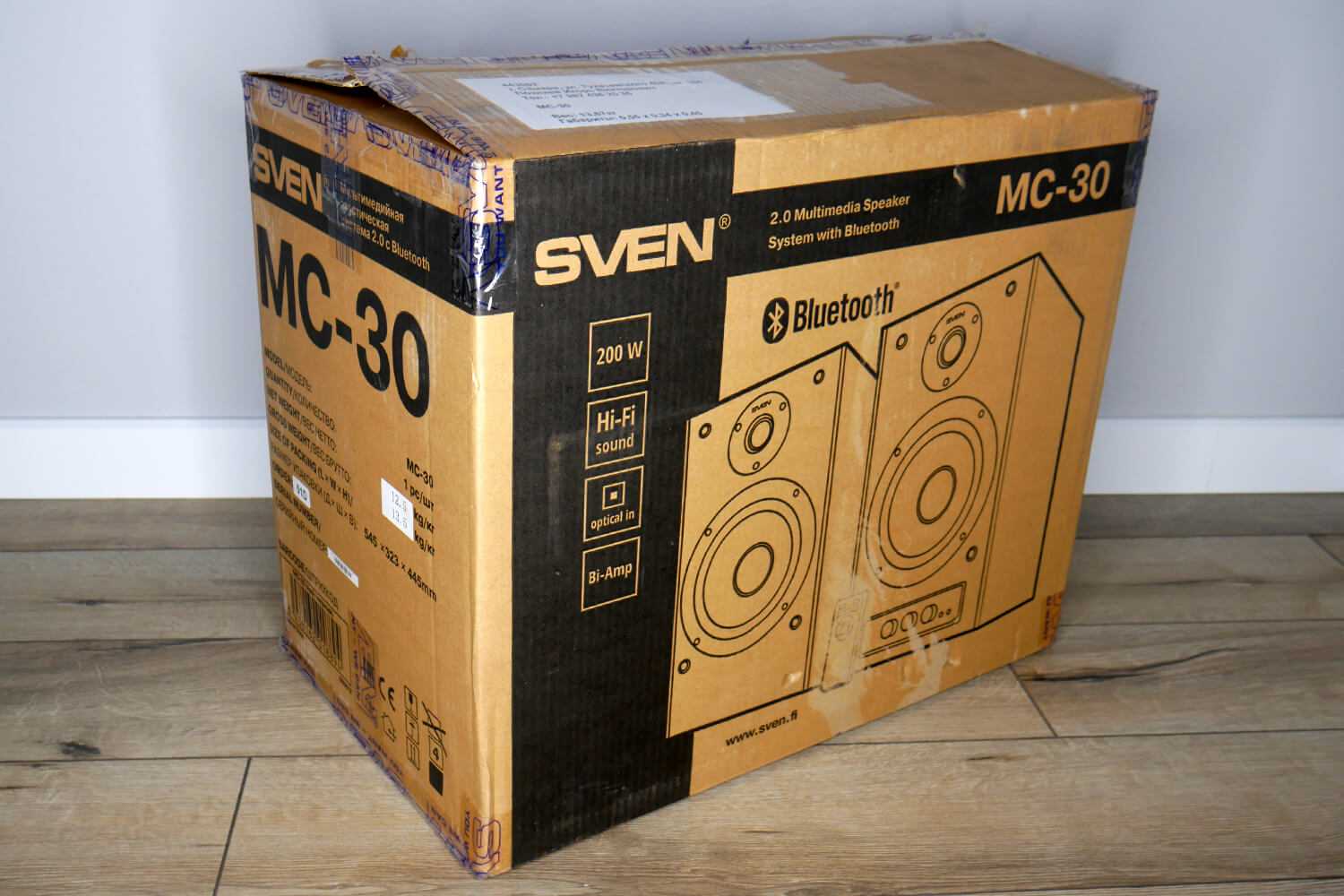 Выбор остановил на флагманской модели Sven MC-30, которая весит 10,8 килограмма. Коробки две. Первая — транспортировочная из грубого картона. Внутри нее вторая, в которой и находятся колонки, к которым прилагается компактных размеров пульт дистанционного управления, выглядит привлекательно. Выполнена в фирменных цветах бренда — голубом и белом.