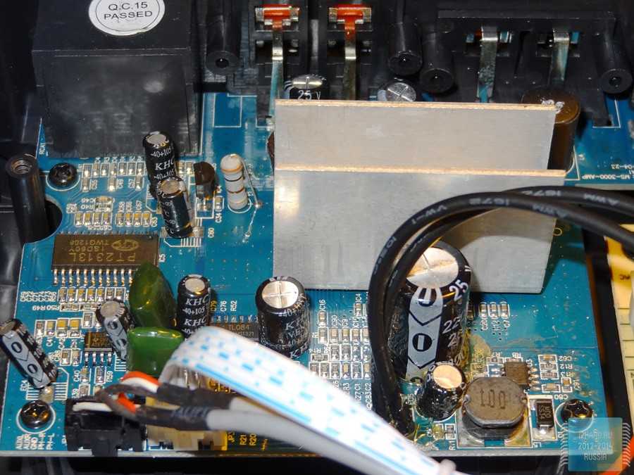На плате усилителя можно заметить микросхему 4-х канального цифрового аудиопроцессора PT2313T производства компании Princeton Technology, ответственного за регулировку усиления, тембра и коммутацию сигналов с различных источников. Под не очень массивным радиатором скрываются две микросхемы TPA3123D2, работающих в импульсном режиме D с высоким КПД. Именно поэтому радиатор такой небольшой. Каждая микросхема TPA3123D2 способна выдать в два канала с нагрузкой 4 Ом мощность до 25 Вт на канал при напряжении питания 27 В или до 20 Вт при напряжении питания 24 В, хотя сама микросхема работает в диапазоне питающих напряжений от 10 до 30 В. Одна из микросхем работает в стандартном двухканальном включении, а вторая в мостовом режиме является усилителем сабвуфера, выдавая итоговую выходную мощность до 40 Вт.