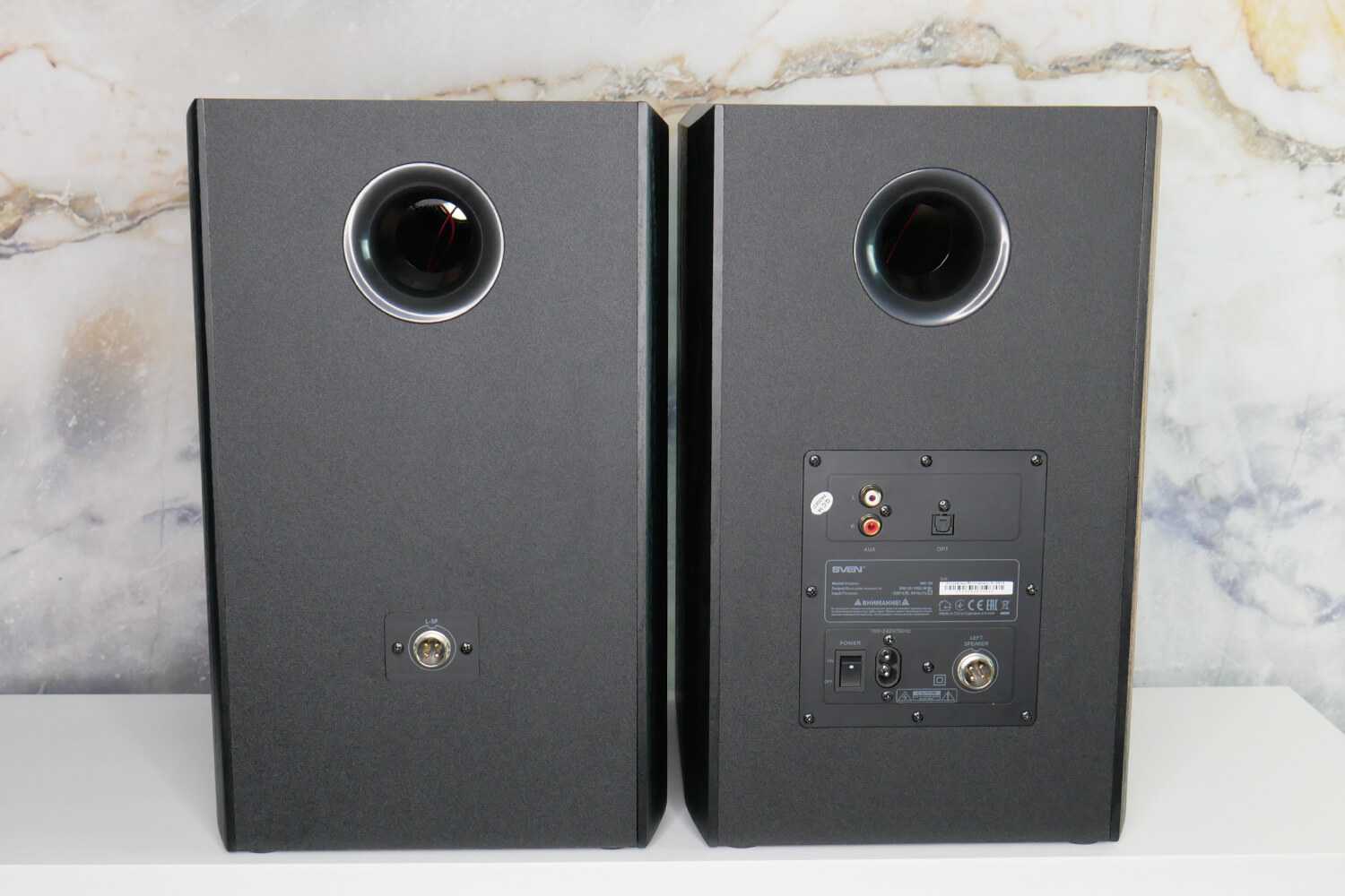 На тыльной стороне громкоговорителей расположен стандартный клеммник для акустических проводов и фазоинвертор. Достаточно большой диффузор сабвуфера (165 мм) позволяет естественно и равномерно воспроизводить заданный низкочастотный диапазон 35 – 150 Гц.