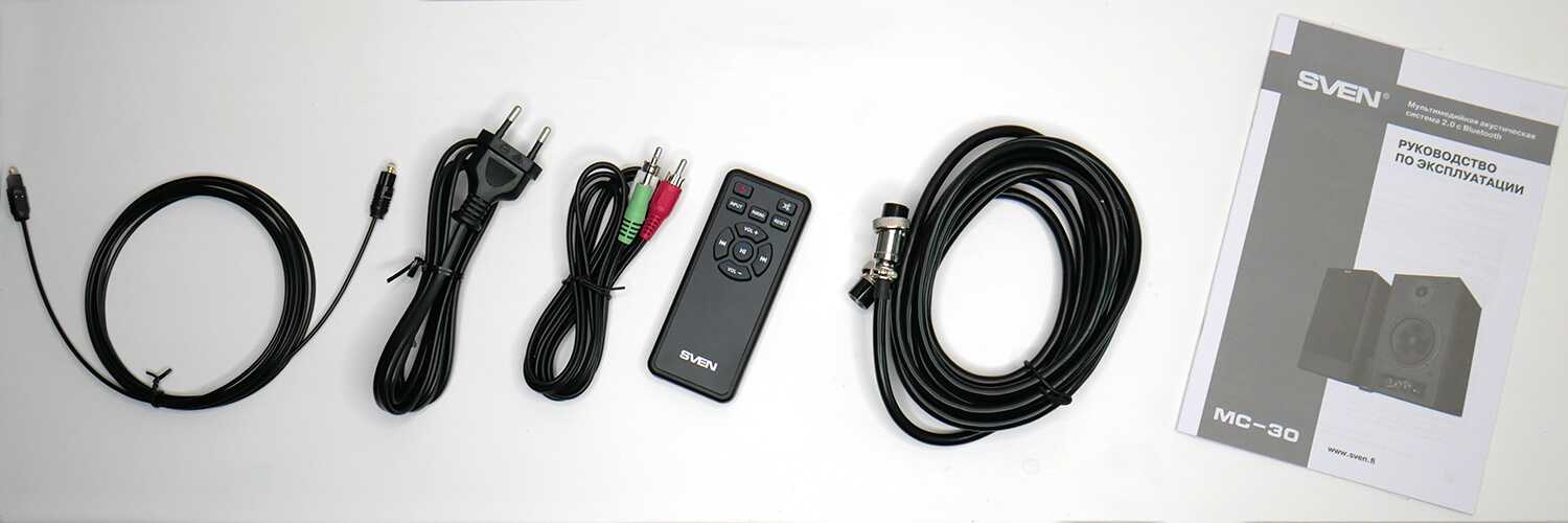 Акустическая система Sven MC-30 продаётся в весьма приятной комплектации. В большой коробке поместились: сами колонки, оптический кабель, аудио-кабель 3,5 мм на 2 RCA, акустический кабель для соединения колонок, шнур питания, пульт ДУ с батарейкой.
