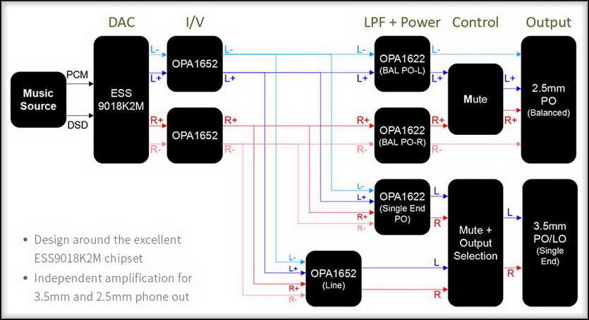 Аудиотракт разделяется на 2 канала сразу после усилителя. Балансная разводка проходит до оконечных усилителей OPA1622 для балансного 2,5-миллиметрового разъема. Аналогично получается небалансный сигнал для основного 3,5-миллиметрового выхода. Итого, по 4 линии с «оконечников».