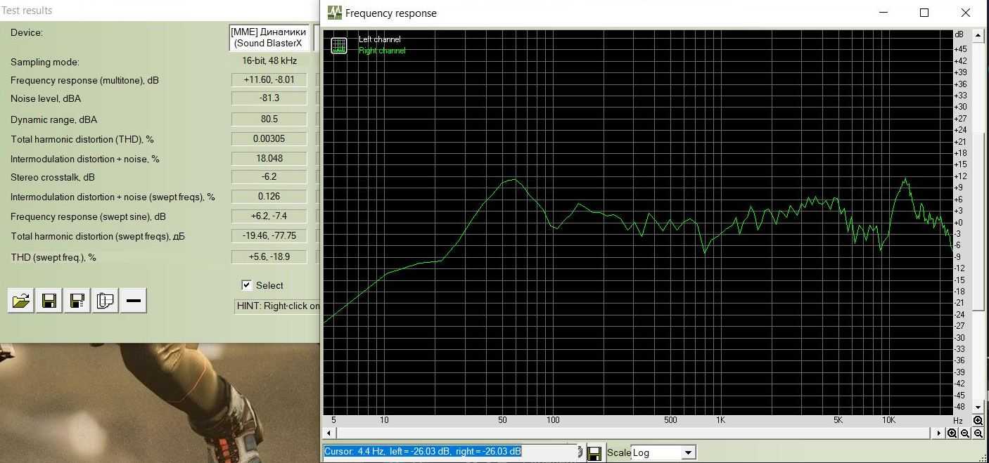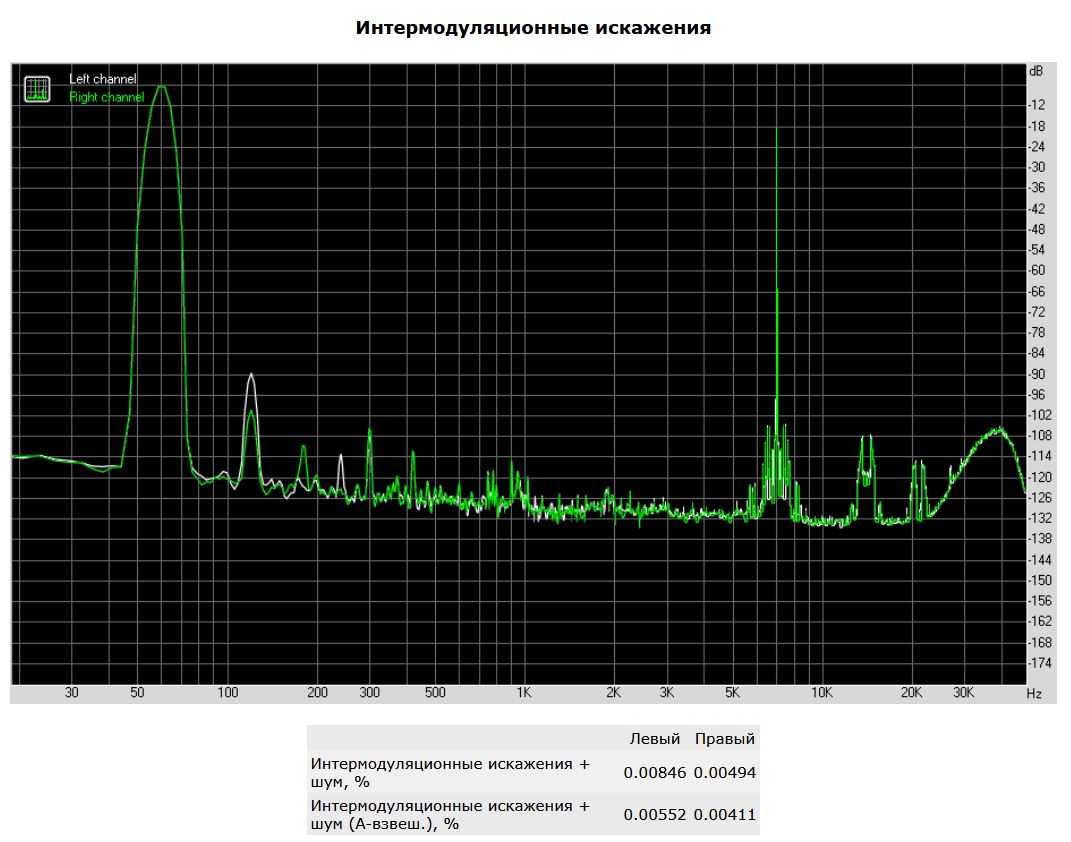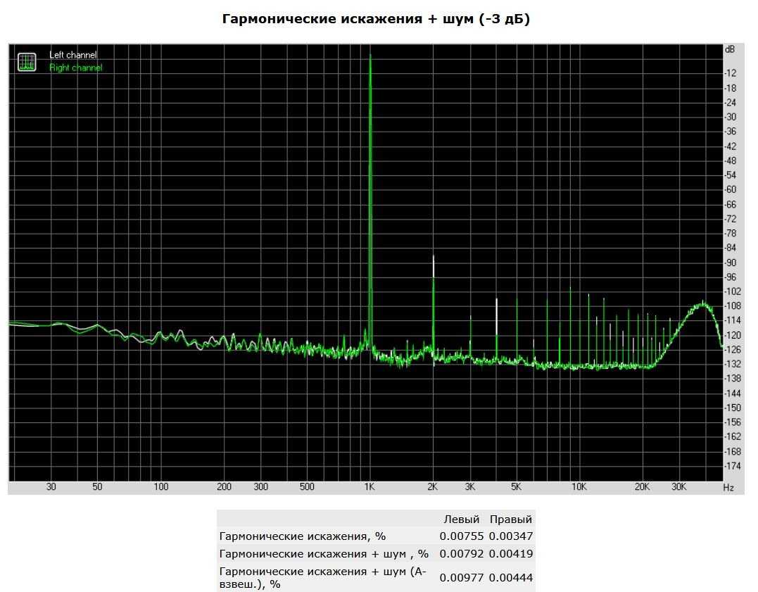 Уровень шумов и коэффициент гармоник на хорошем уровне, он несколько выше паспортных характеристик, но это нормально для измерений в подобных условиях. Значительный шум гармонических искажений, кратных 1 кГц – это скорее всего влияние электрических помех и наводок самого ПК.
