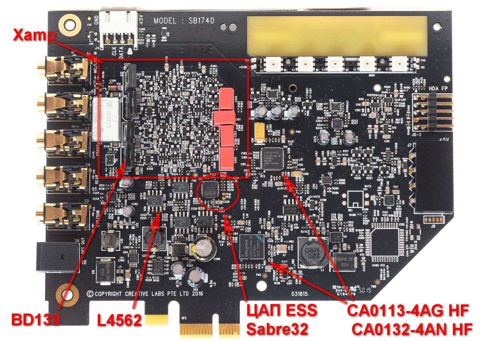 Звуковой процессор BlasterX Acoustic Engine состоит из двух чипов: CA0113-4AG HF и CA0132-4AN HF; именно они обслуживают выходные каналы и занимаются обработкой звука, в том числе и виртуального объемного.