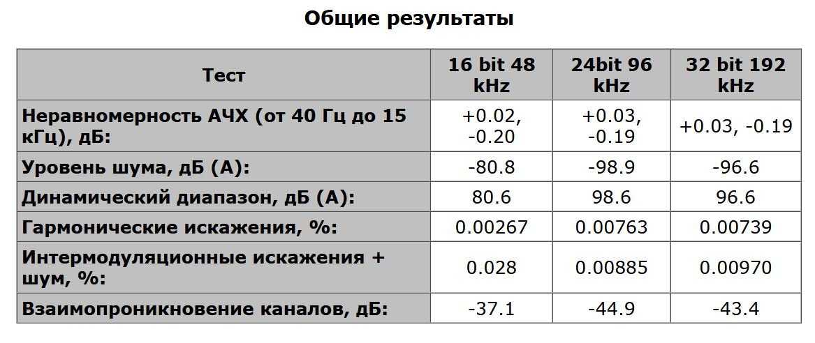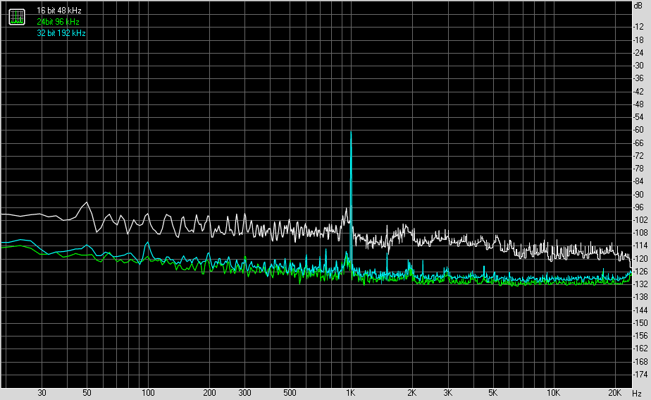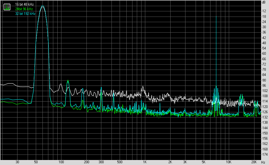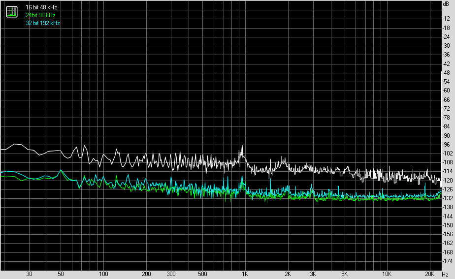 Также мы сравнили работу карты в разных режимах: 16 бит 48 кГц, 24 бит 96 кГц и 32 бит 192 кГц.