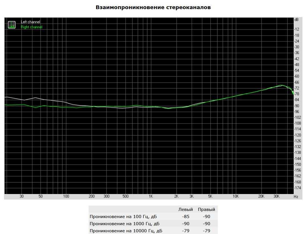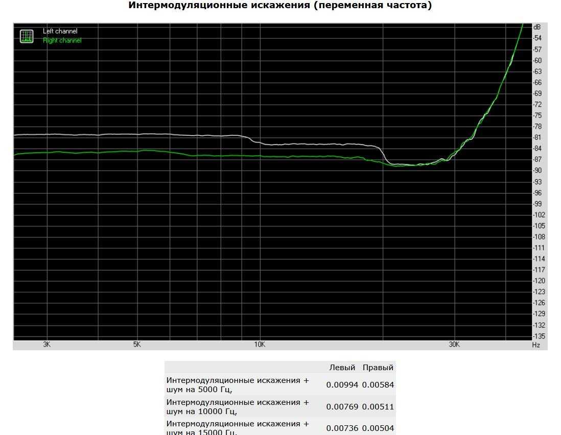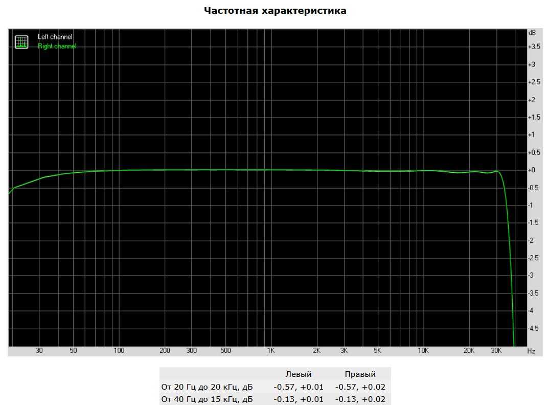 АЧХ равномерный, на высоких частотах спад только после 30 кГц, на уровне 20 кГц — небольшие искажения графика, но в других тестах они не проявлялись. На низких частотах спад не более 0,5 дБ ниже 50 Гц. На слух завалы менее 0,5 дБ даже на 20 кГц будут просто незаметны.