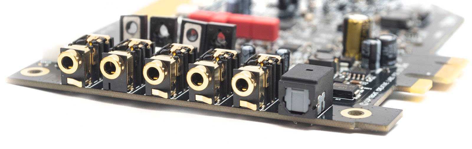 Тыльная металлическая планка закрывает пять позолоченных аудиоразъемов 3.5 мм. Каждый разъем промаркирован. Также имеется оптический разъем TOSLINK.