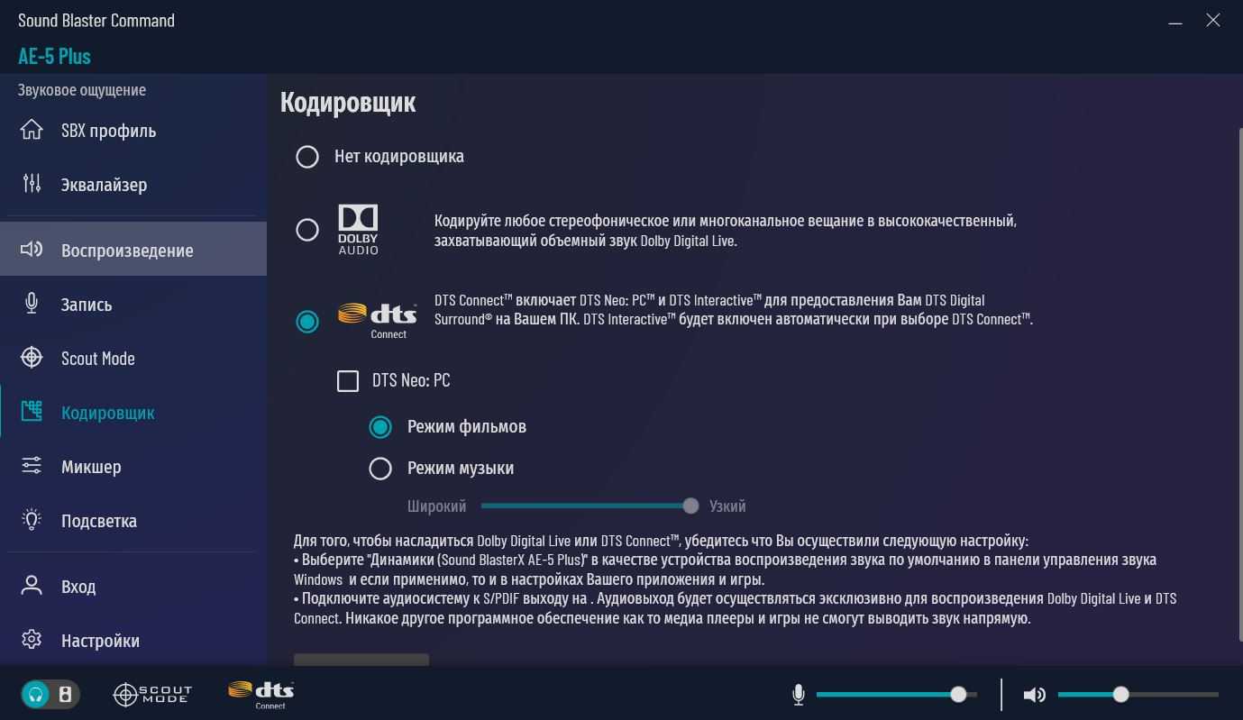 - Поддержка Dolby Digital Live и DTS Connect кодирования;