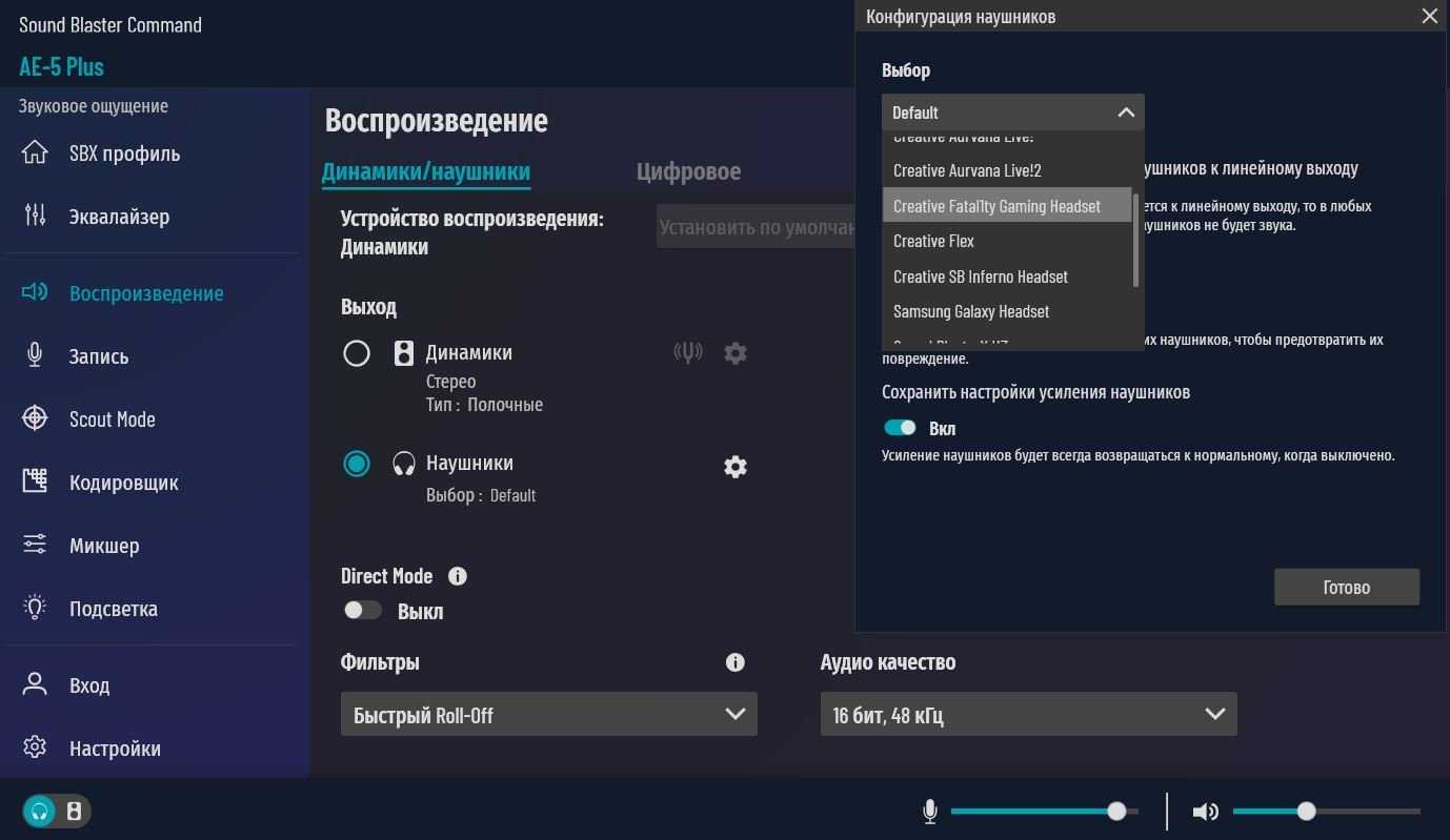 На этой же вкладке включается режим Direct Mode – он отключает все настройки и передает звук без обработки. Для данного режима имеются три фильтра Roll-off. Сдвиг фазы не все расслышат, но можно послушать и выставить то, что вам больше симпатично.