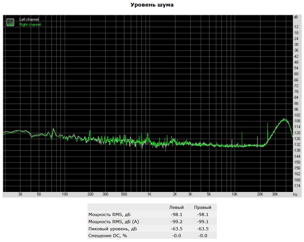 На высокочастотные шумы в виде горбика от 20 до 40 кГц не нужно обращать внимания — это собственный шум за пределами слышимого. Проникновение сетевых 50 Гц и кратных гармоник незначительные.