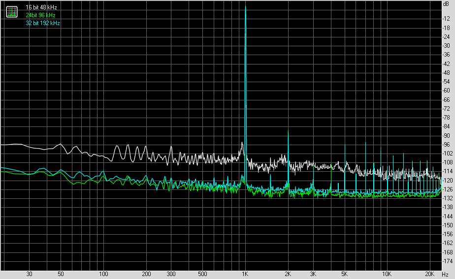 По шумам наиболее предпочтительно выглядит режим 24 бит, разница- до 30 дБ с режимом 16 бит, на слух это будет уже заметно. Больше всего гармонических искажений наблюдается в режиме 32 бит.
