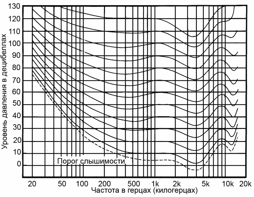 Мы уже отметили, что громкость звука зависит не только от его давления, но и от частоты. Кривые равной громкости, отражающие особенности слуха человека в зависимости от высоты тона, были опубликованы Флетчером и Мэнсоном в 1933 г.