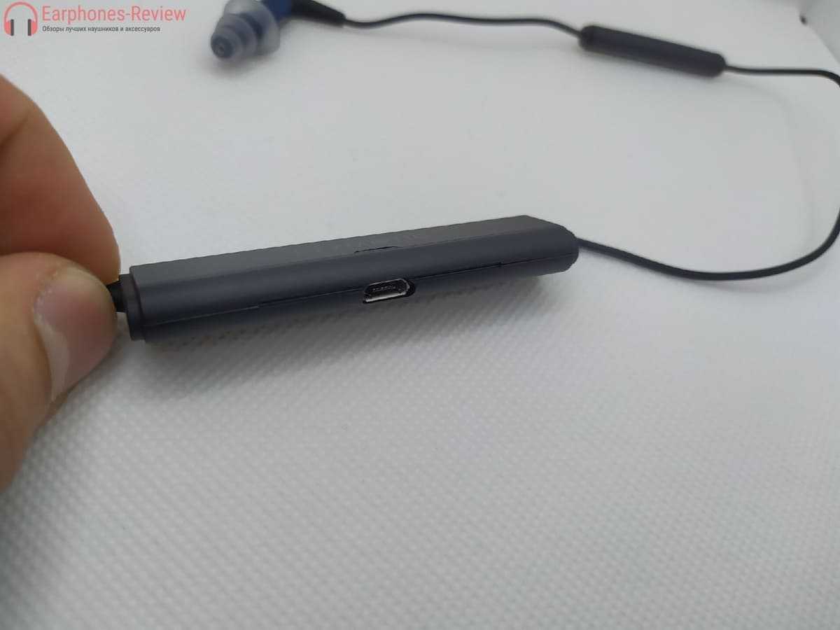 Беспроводной адаптер Etimotion BT состоит из довольно большого основного блока и двух проводов. Блок вытянутый, довольно тяжёлый. На нём есть только разъём microUSB и индикатор. Провода, выходящие из него, тонкие, но не выглядят откровенно хрупкими. Хотя и прочными их не назову. Они прорезиненные, никакой оплётки и укрепления нет, кроме уплотнений в местах соединения с блоком. На правом проводе есть пульт управления с микрофоном, на левом – ничего. Штекеры MMCX угловые, прорезиненные. Снизу есть небольшая засечка. Скорее всего, для более плотного контакта. Из-за этого и подходит не каждый кабель.