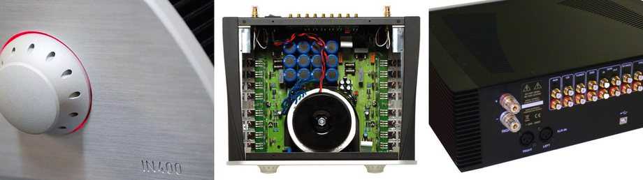 Флагман IN400 собран в антивибрационном корпусе, ребристые изогнутые боковины которого превосходно отводят тепло и изготавливаются из массивных алюминиевых блоков по уникальной технологии. В цепях используется конфигурация «двойное моно», причем для каждого канала имеется отдельный регулятор громкости. Применяется двойная заземляющая схема типа «звезда». На выходе установлены мощные MOSFET-транзисторы. Благодаря БП с тороидальным трансформатором в 1015 ВА и общим емкостным запасом в 93400 мкФ усилитель способен развить мощность в 300 Вт на канал при 4 Ом. Доступна установка плат фонокорректора или цифровой платы. В тыльную панель помимо основной коммутации встроен USB-порт для подключения к компьютеру. Модель имеет дисплей, балансный вход и весит 20 кг.