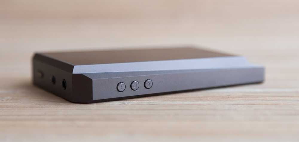 На левом торце расположился блок управления воспроизведением, состоящий из трёх клавиш — две кнопки переключения между треками и кнопка Воспроизведение/Пауза. Сверху два выхода на наушники (обычный джек 3,5 мм и балансный 2,5 мм) и кнопка включения.