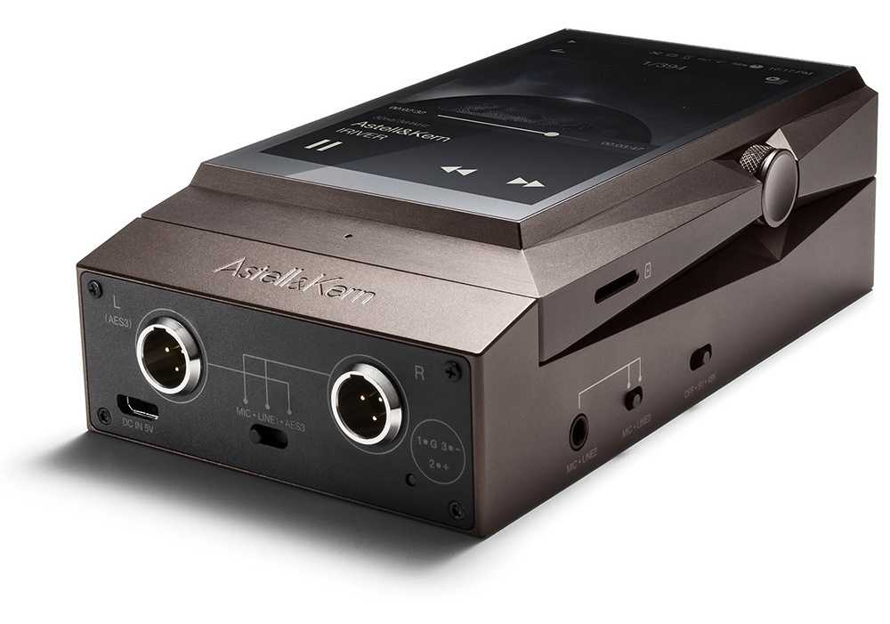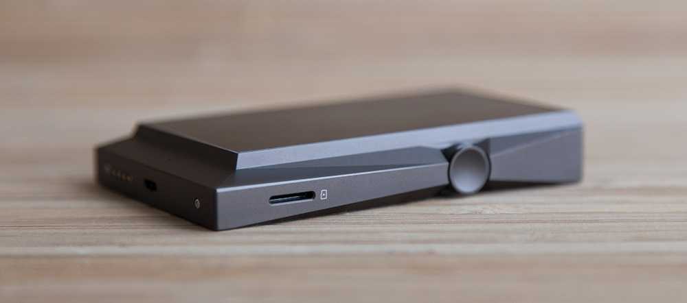 За исключением скоса на правой грани, плеер сделан в виде почти идеального параллелепипеда, пожалуй, он даже смог бы сняться в «2001: A Space Odyssey». Элементов управления по-астелловски не много. На левой стороне находятся кнопки навигации и воспроизведения/паузы, тут же разместили слот для карт MicroSD. Приятно, что производитель не стал жадничать и оснастил плеер 64 ГБ встроенной памяти. Верхняя грань содержит два выхода на наушники, обычный и балансный, а также кнопку питания. Правая, скошенная грань содержит регулятор громкости, он, как обычно, сделан с энкодером, и по ощущениям — на качестве не экономили: вращение ровное, щелчки чёткие, регулировка корректная. Рукоятка регулятора даже люфтит меньше, чем колёсико в моём AK320. На нижней стороне размещён MicroUSB-коннектор, его назначение традиционно: зарядка, доступ к файлам, USB ЦАП и вывод цифрового сигнала на внешние ЦАПы. Модный USB-C и функцию USB OTG, видимо, решили оставить для будущих моделей.