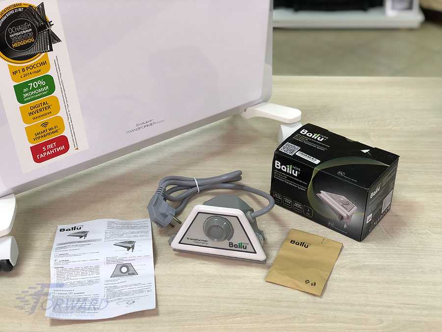 Комплектация коробки с механическим блоком управления: блок управления, документы и болт для крепления блока к отопительному модулю. Разобраться в нем проще простого, есть регулятор температуры, а с боку вы можете найти переключатель мощности на 1 и 2. Подробное и доступное руководство, которое поможет разобраться даже самым отдаленным от бытовой техники людям.