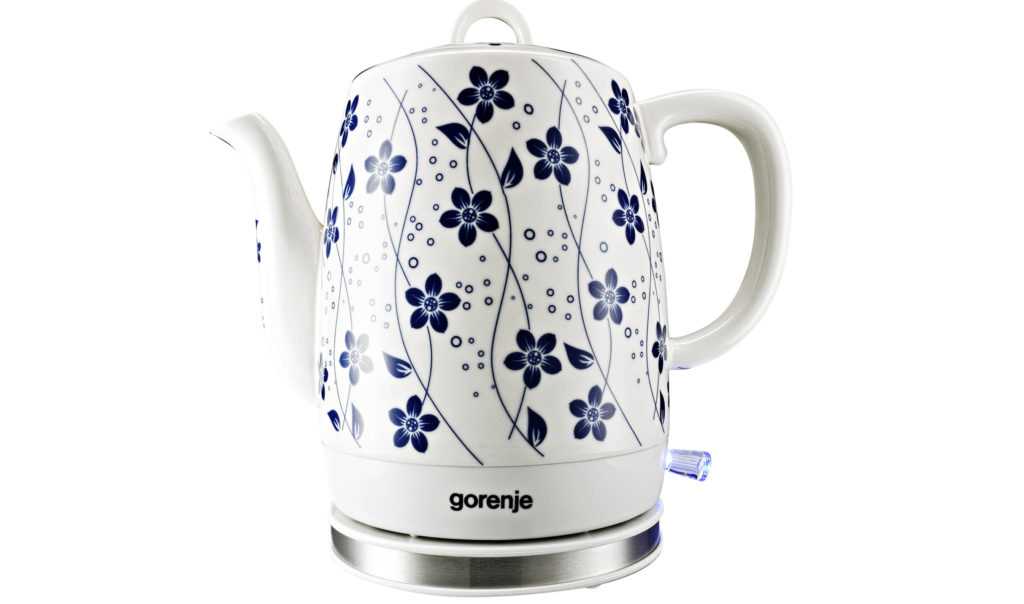 Керамический чайник Gorenje K10C емкостью 1 литр имеет мощность в 1850 Вт. Вода закипает за минуту. Устройство практически не образует накипи, так как плоский нагревательный элемент спрятан под основанием.
