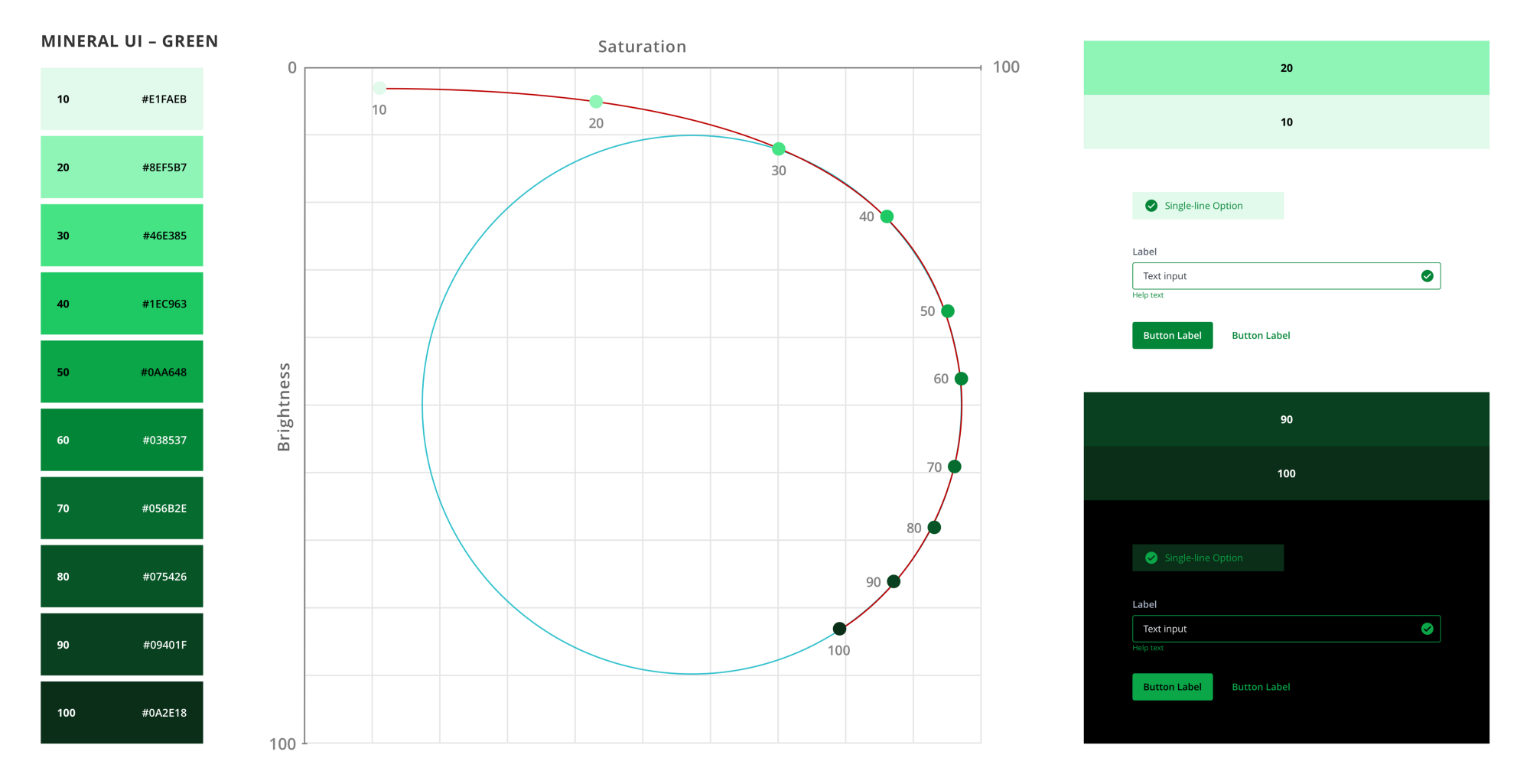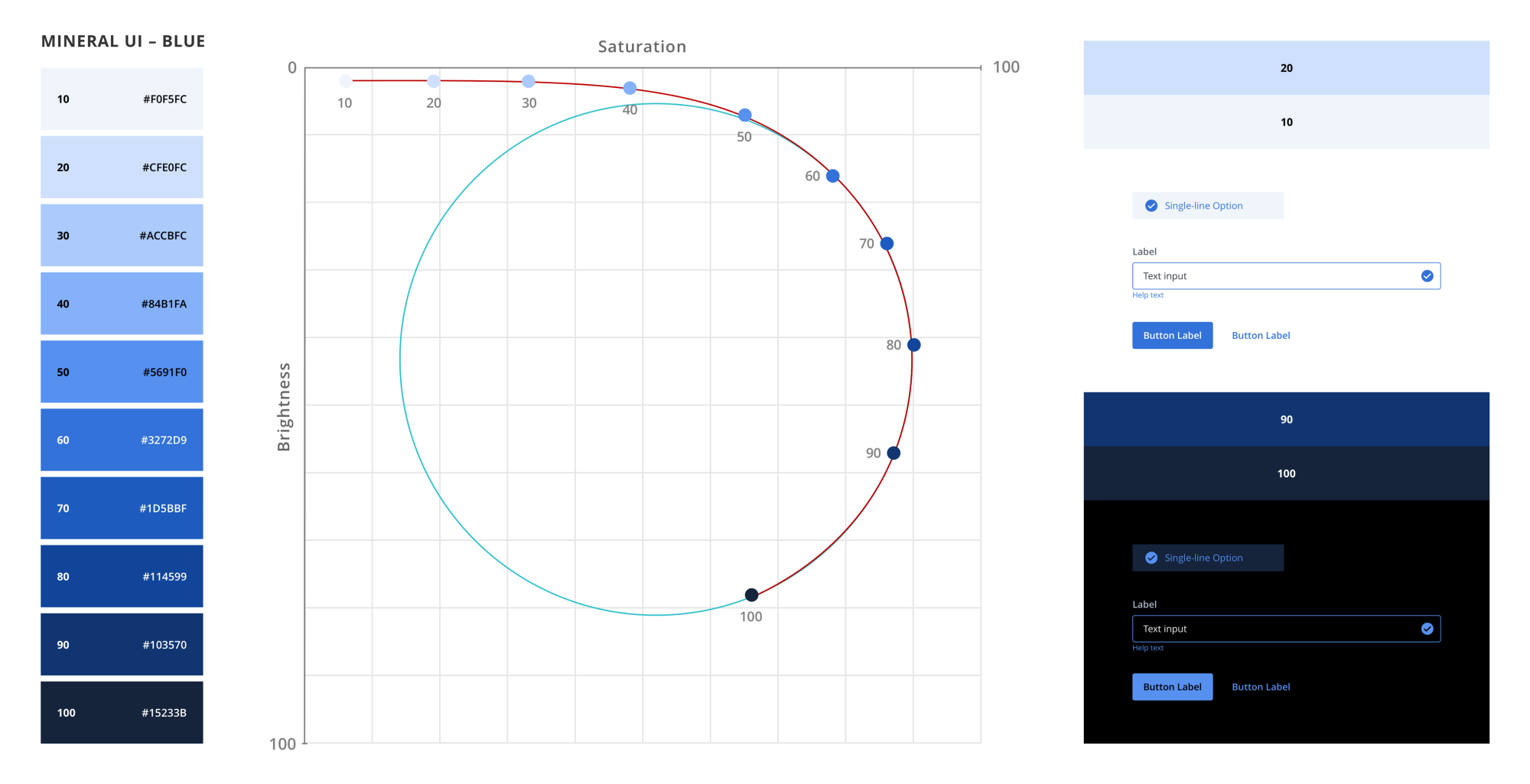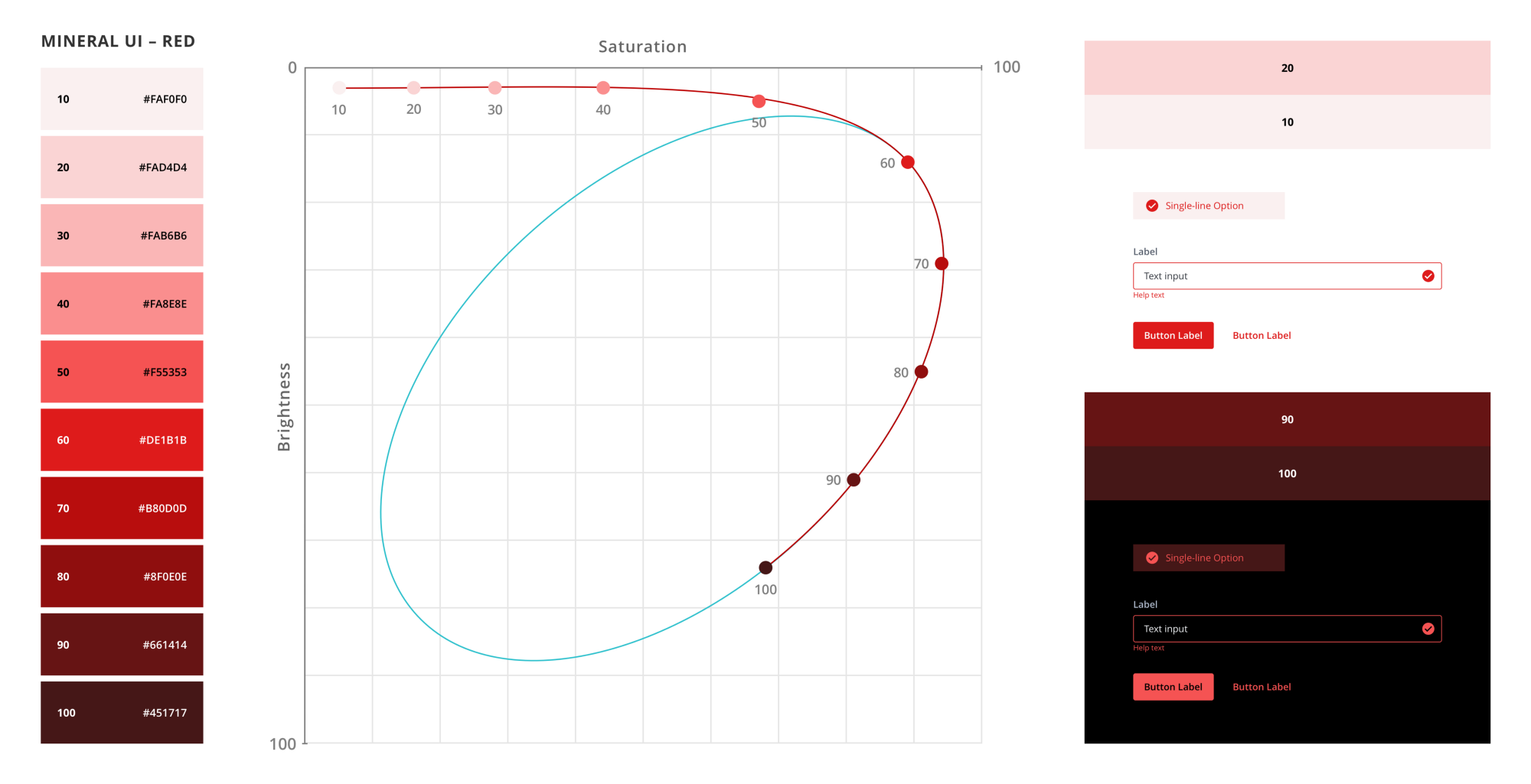 Подход, который мы использовали, похож на первую версию палитры , с одной большой разницей: мы использовали овальную кривую для уменьшения насыщенности более темных значений, чтобы они выглядели естественно в тёмном интерфейсе.