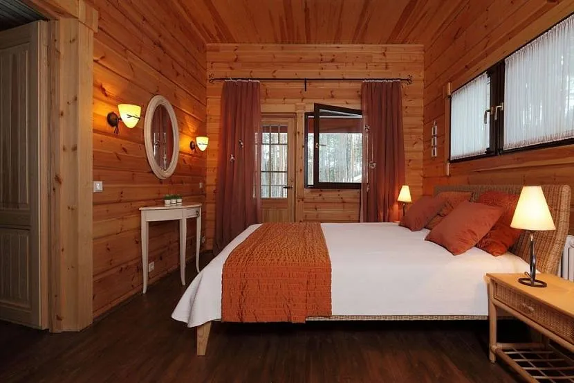 Сканди спальня в тонах дерева и шоколадаИсточник iraivanovadesign.com