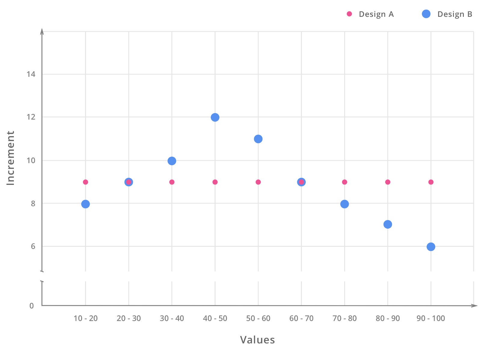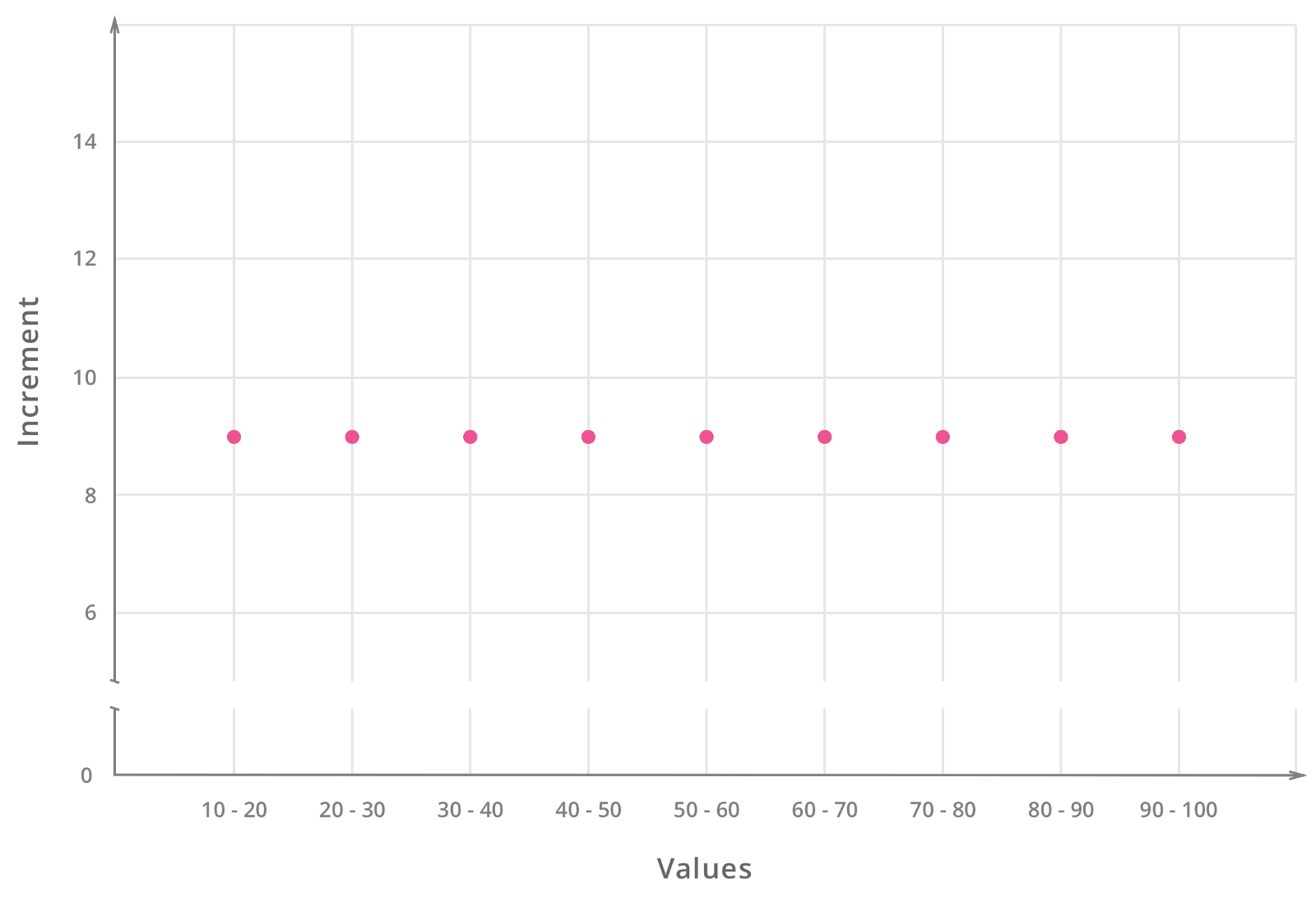 Мы поставили яркость темы-10 на 95%, яркость темы-60 на 45% и яркость темы-100 на 15%. Затем мы пробовали разные последовательности непоследовательных  увеличений значений, которые вместе на графике выглядели как «рост, пик и падение» и обнаружили, что если значения повышались одинаково, более низкие или более высокие значения значительно отличались от таковых в середине.