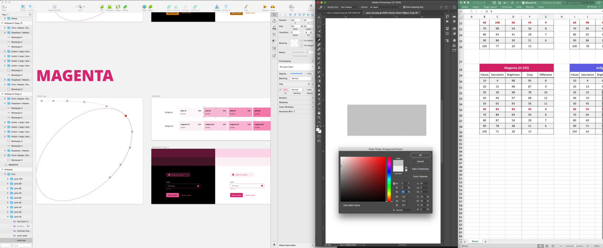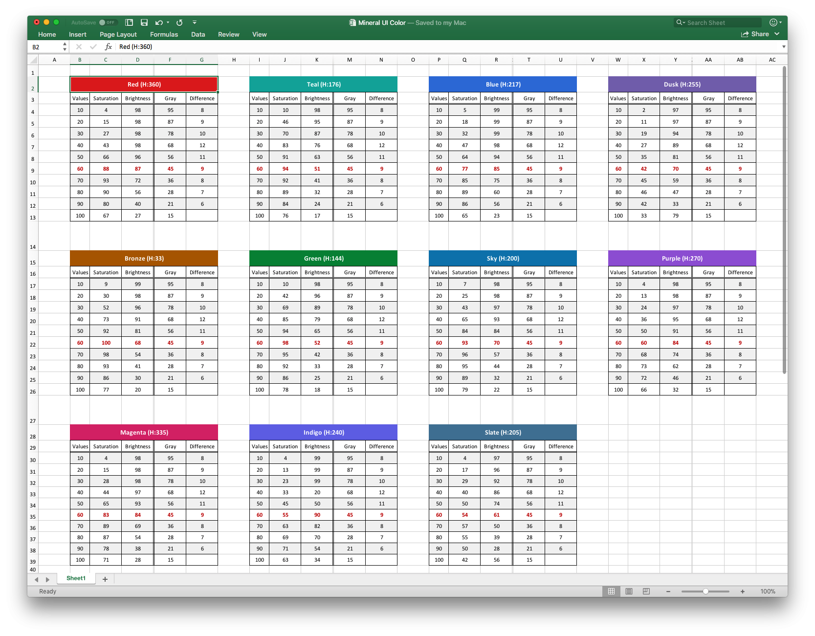 Мы упростили себе работу, записав каждое значение цвета в одном месте — так делать особенно удобно, когда есть вероятность, что другим людям нужно будет ссылаться на вашу работу. На этом этапе мы также решили, что было бы неплохо записать точное значение RGB или HEX для разработки. Мы решили использовать HEX.
