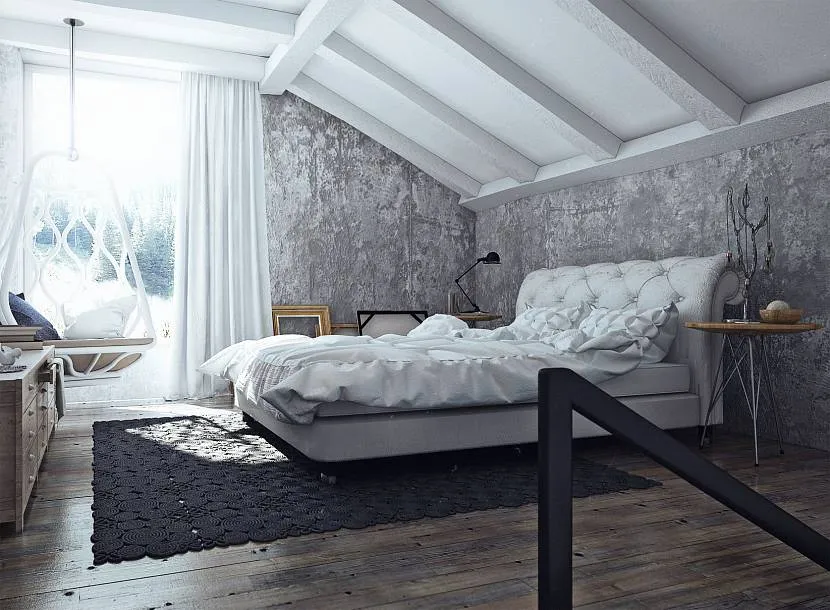 Спальня лофт с подвесным креслом в холодных тонахИсточник yandex.ru