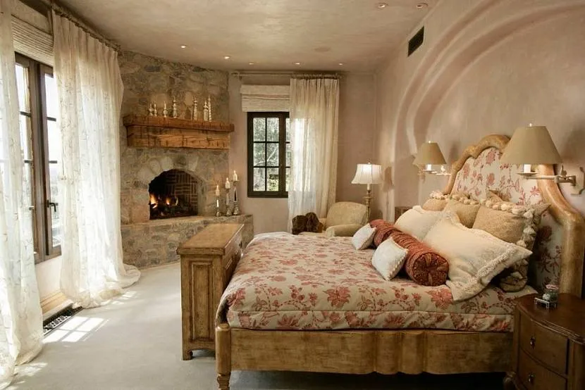 Сочетание цветов стиля кантри для спальни с аркой и каминомИсточник chidaneh.com
