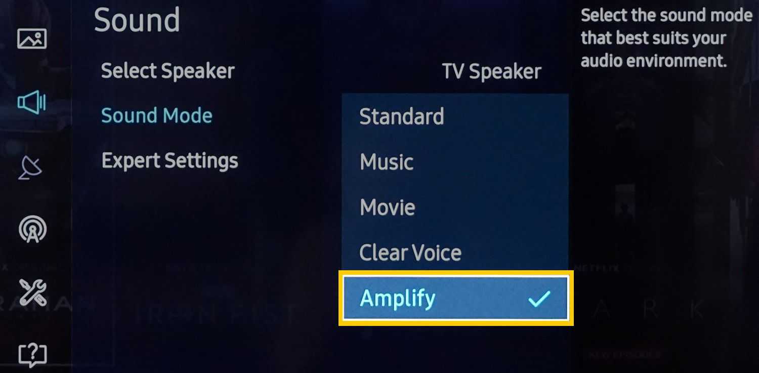 Одна из опций, которую может предложить телевизор Samsung, — это Clear Voice (не то же самое, что версия LG), которая повышает уровень голоса и снижает уровень фонового звука.