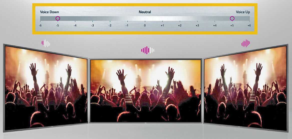 Clear Voice для телевизоров LG делает голоса более четкими. Вы можете включить его и позволить ему автоматически управлять уровнем звука, но если у вас есть Clear Voice версий II или III, вы можете отрегулировать акцентирование голоса вверх или вниз на шесть позиций.