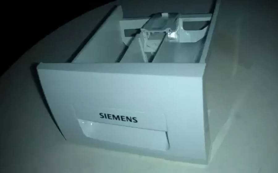Кюветка достается достаточно просто, нажатием пальца на середину элемента, где имеется маленькая выемка и легким движением в сторону от машины Siemens IQ300. Это может понадобиться для очистки засохшего порошка и образовавшейся грязи. При обратной установке проблем возникнуть не должно.