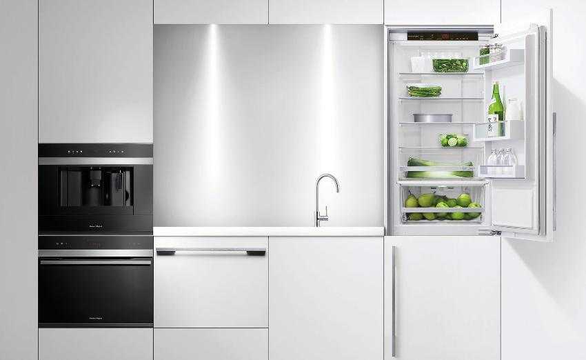 Модели встраиваемых холодильников обшиваются материалом, аналогичным фасаду кухонного гарнитура