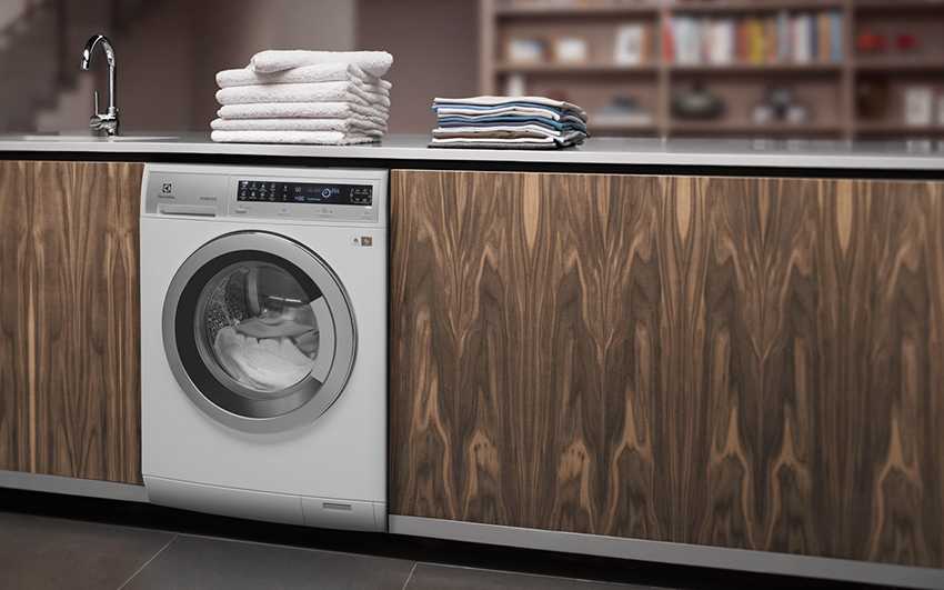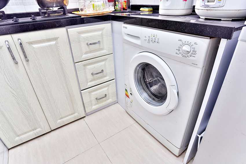 Отличным решением будет вмонтировать стиральную машину в кухонную мебель, расположив на верхней панели столешницу. При таком варианте нужно тщательно просчитать все размеры до сантиметра, чтобы не было неприятностей после покупки агрегата.