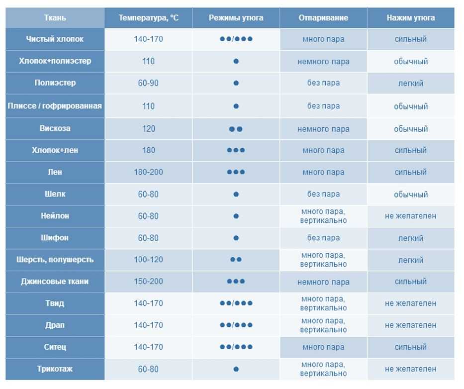 Чтобы не заучивать подобные таблицы, важно помнить одно правило: синтетику гладят без функции пара! Остальное — можно, мощность определять по мере сложности разглаживания