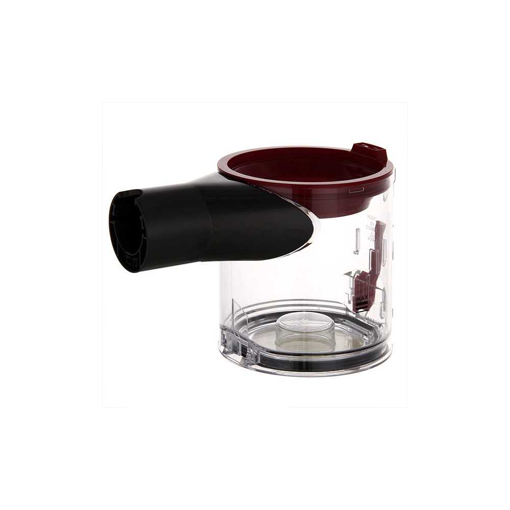 Всасываемый мусор собирается в прозрачной колбе, на внешней стенке которой нанесен указатель уровня Max. Емкости пылесборника хватает для очистки помещения площадью 35-40 м², инструкция рекомендует удалять пыль при достижении метки Max. Дальнейшая уборка приводит к попаданию пыли в циклонные элементы и снижению производительности турбины.