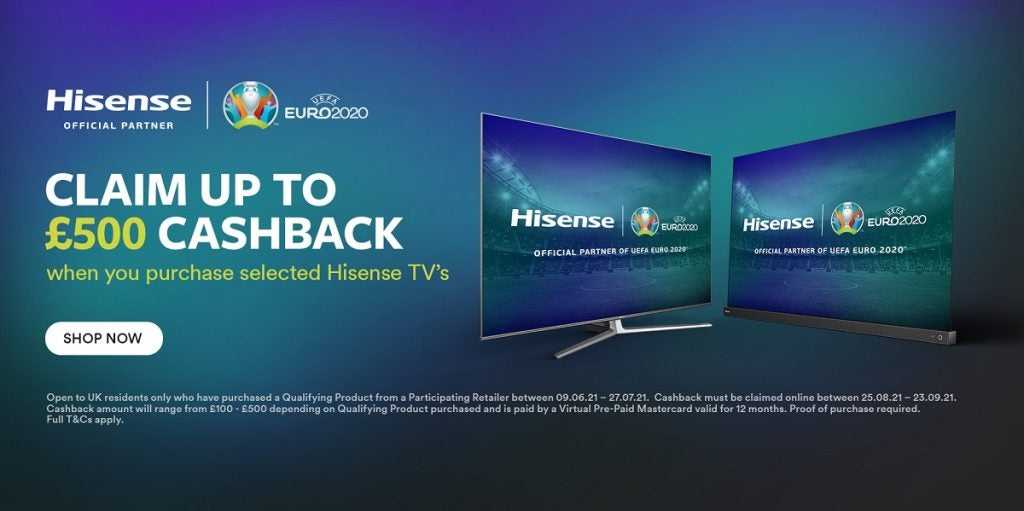 В преддверии ЕВРО-2020 Hisense запускает акцию, в рамках которой при покупке телевизоров Hisense можно заработать до 500 фунтов стерлингов в виде кэшбэка.
