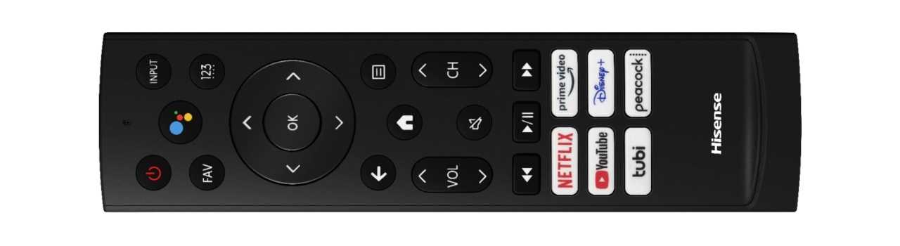 Входящий в комплект пульт гораздо менее загружен, чем тот, который был в предыдущей модели, полностью исключая редко используемую цифровую клавиатуру и цветные кнопки. Это черная прямоугольная палочка, покрытая резиновыми кнопками, с заметной круглой навигационной панелью. Кнопки питания, ввода и Google Assistant расположены над площадкой вместе с комбинированным микрофоном-точечным отверстием и индикатором состояния. Кнопки меню и качельки громкости / каналов расположены под панелью, а под ними расположены элементы управления воспроизведением и специальные служебные кнопки для Amazon Prime Video, Disney +, Netflix, Peacock, Tubi и YouTube.