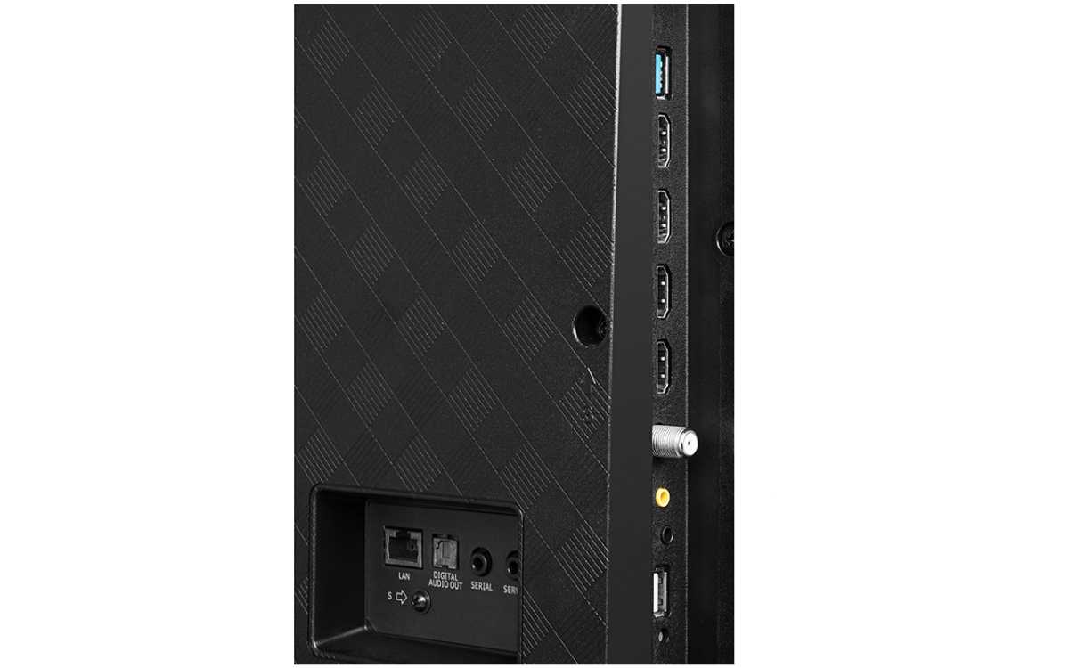 В качестве подставки используется ножка с основанием в форме бумеранга, размах «лап» у которой несколько меньше, чем у распространенных в последнее время «ножек» по краям корпуса – так что при необходимости этот телевизор можно поставить на довольно компактную тумбу. В задней части подставки есть специальная ниша, прикрытая декоративной крышкой, через которую можно пропустить подключенные кабели и спрятать их таким образом от зрителей. Также есть возможность настенного монтажа – на тыльной стороне можно найти крепление VESA 400х300.