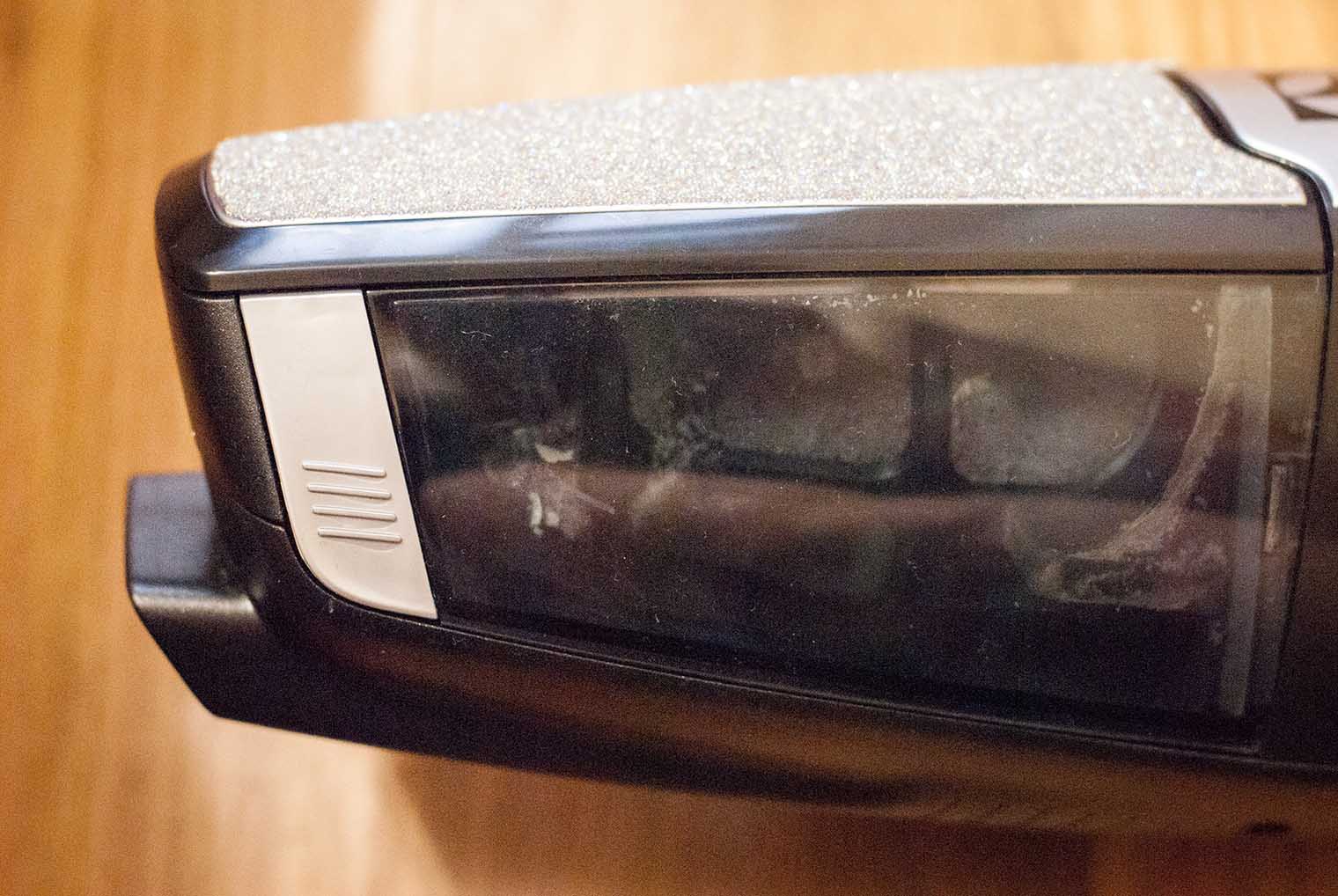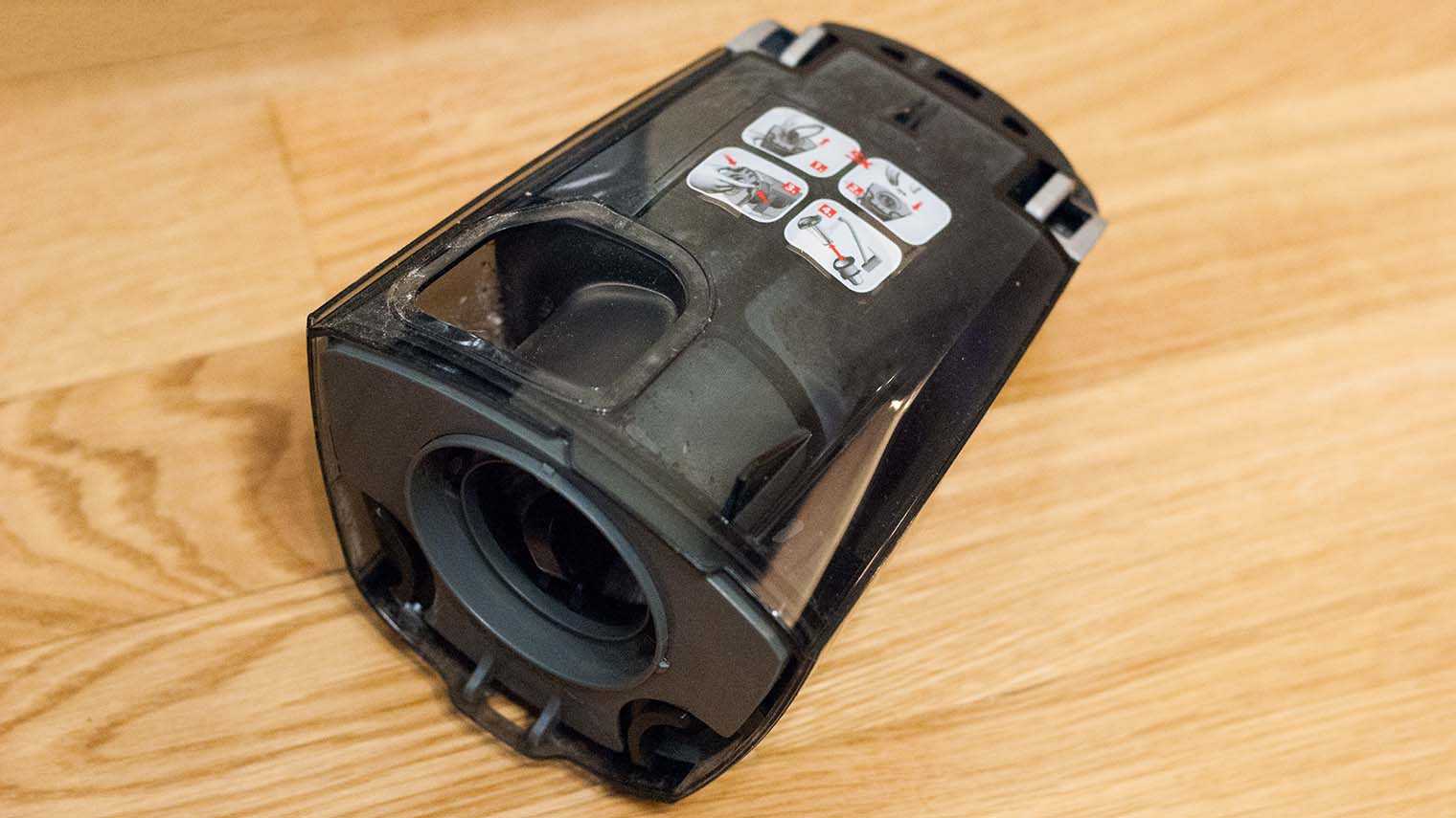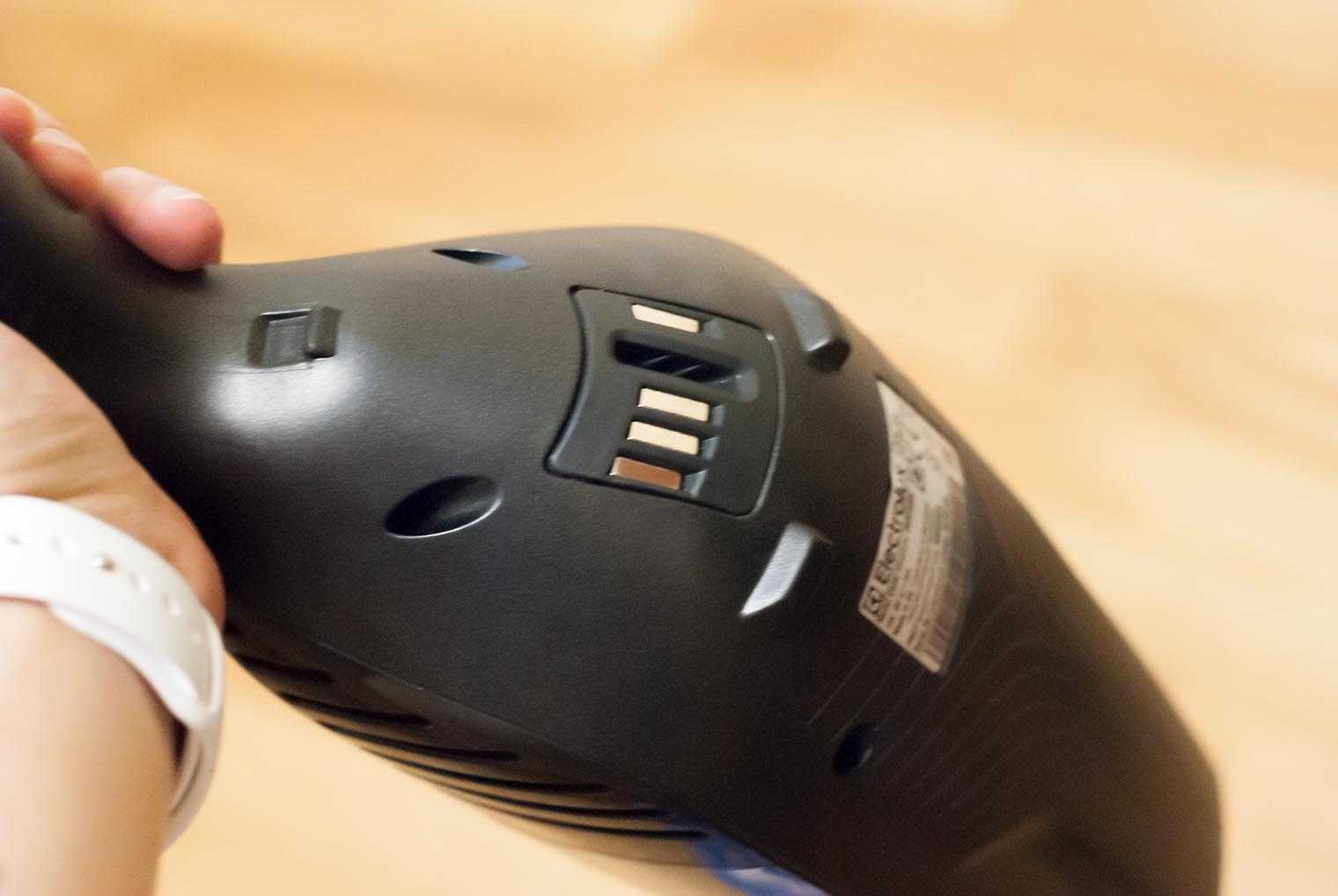 Пылесборник маленький, но очень удобный, легко вынимается и устанавливается на место. Чтобы его опорожнить, надо вытащить держатель фильтров и сами фильтры. Делать это лучше над ведром или пакетом: так как фильтры имеют форму конусов, а не плоских пластин, при их вынимании из контейнера задевается часть пыли, и она может просыпаться. Контейнер можно очистить альтернативным способом: подсоединить шланг обычного пылесоса к отверстию (оно находится на корпусе ручного пылесоса снизу с лицевой части) и удалить грязь.