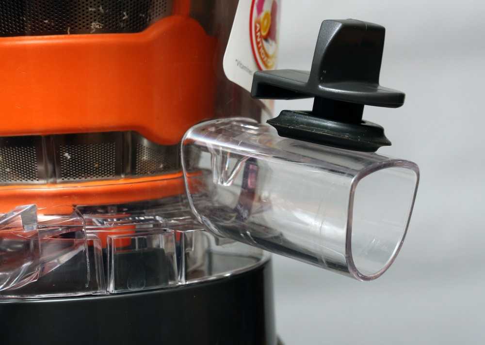 Емкости для сока и жмыха изготовлены из непрозрачного пластика. Для жмыха такое решение понятно, а вот для сока, на мой взгляд, прозрачный кувшин предпочтительнее, но это дело вкуса. Открытое отверстие для жмыха – 5х4,5 см.Носик для сока – длина5 мм, ширина3 мм.
