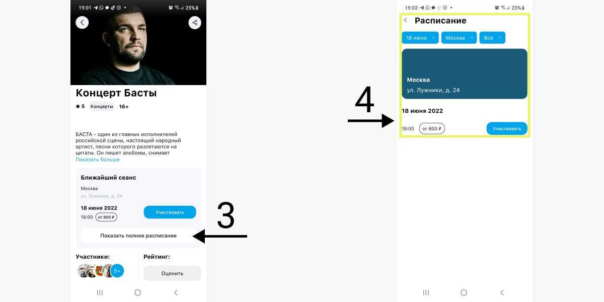 После выбора мероприятия нажмите на него, чтобы посмотреть подробности и полное расписание.