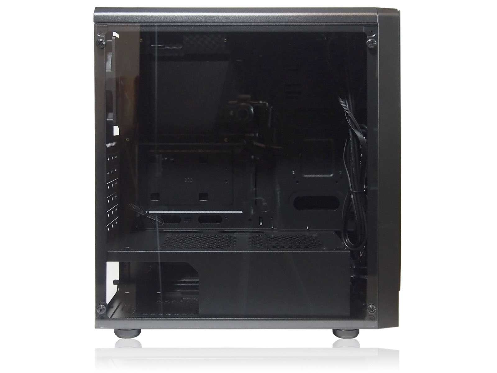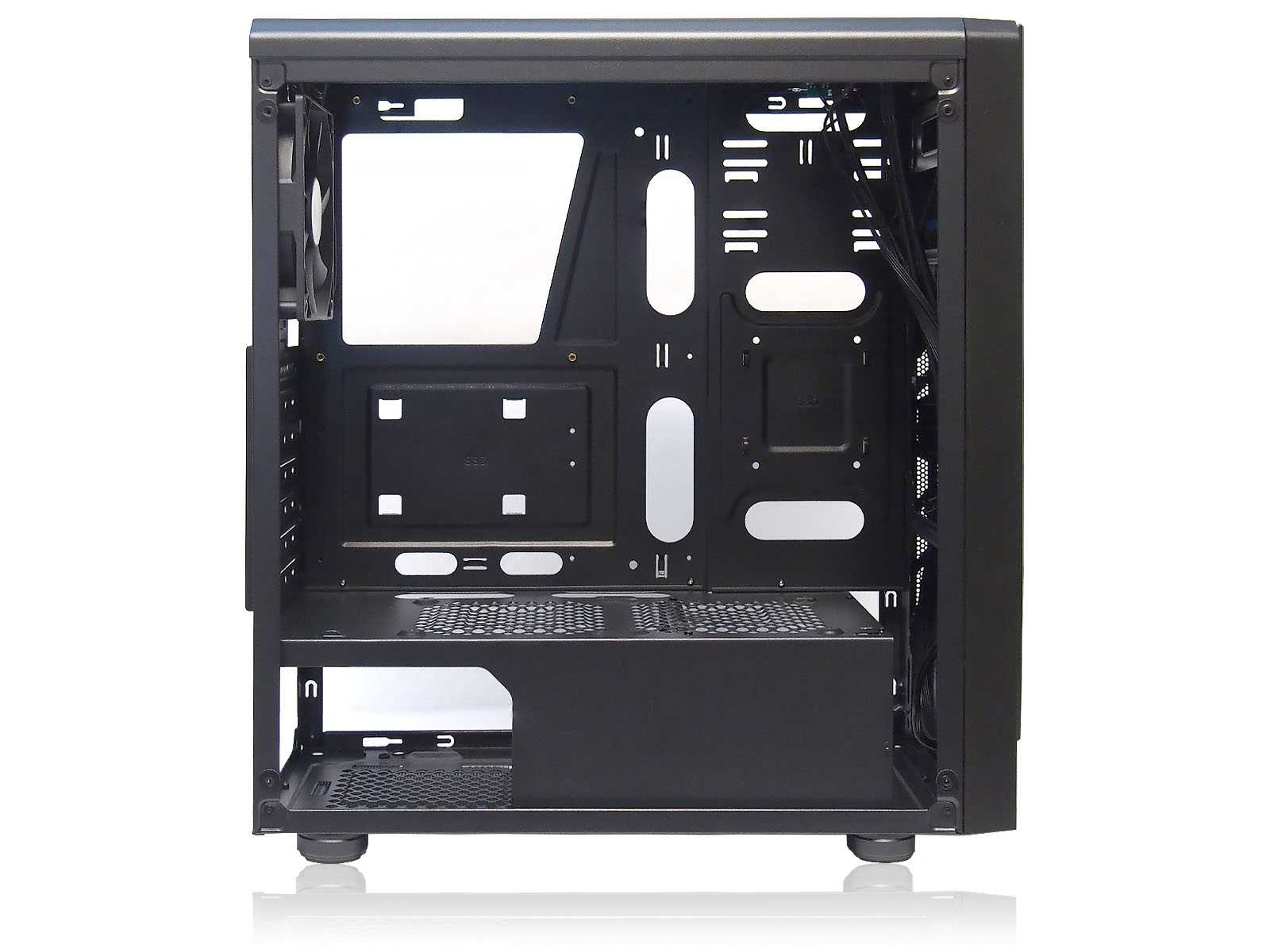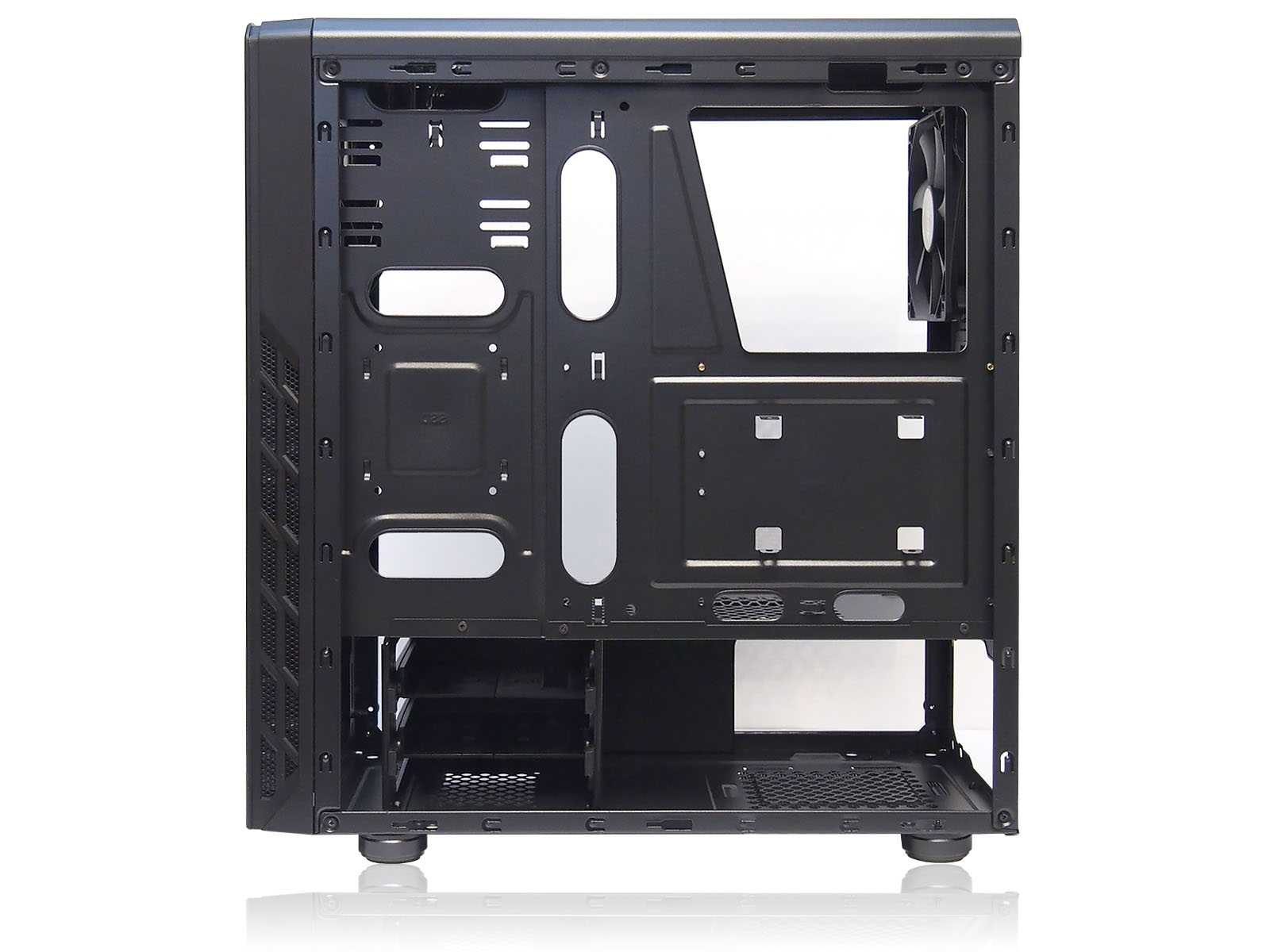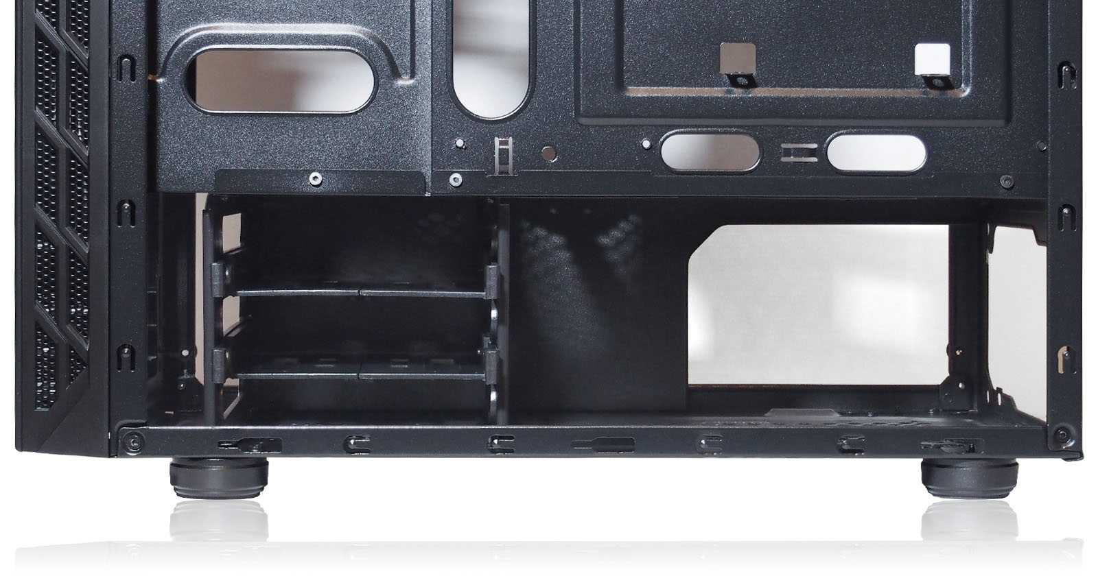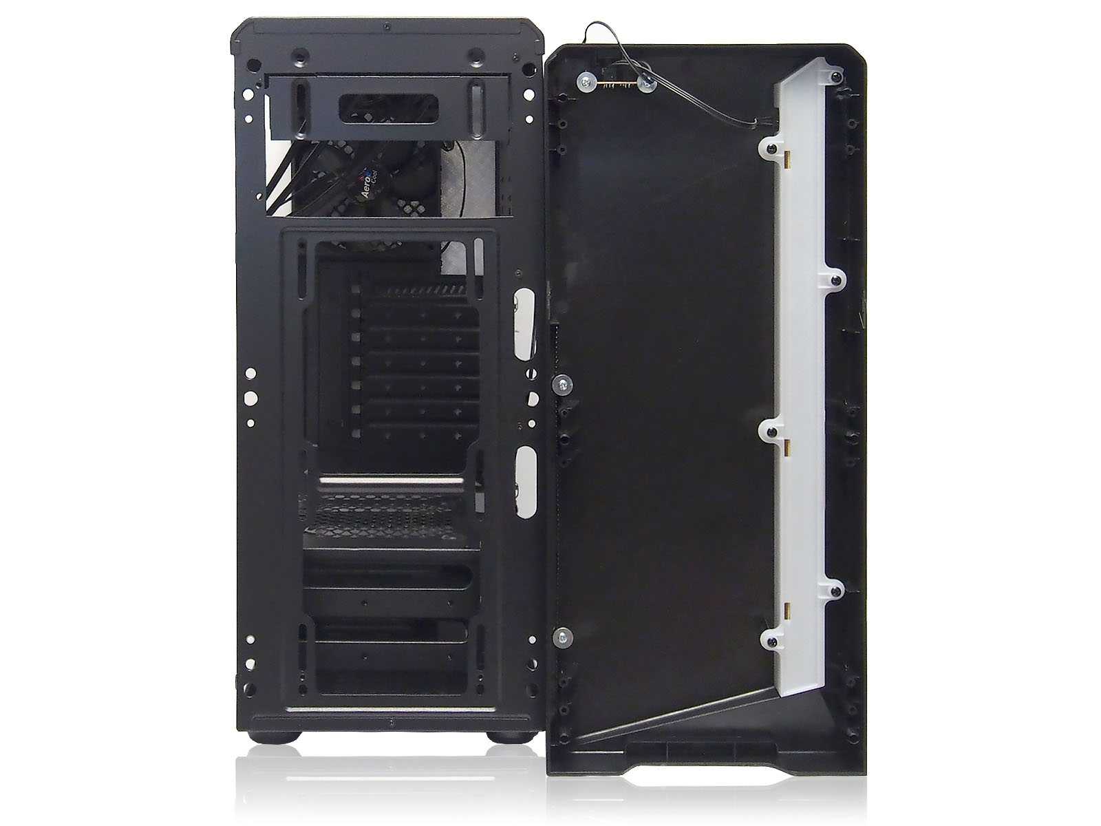 Внутреннее пространство разделено горизонтальной перегородкой на две части: нижний отсек для блока питания и 3,5»-накопителей, верхний — для материнской платы, видеокарты и систем охлаждения. Боковые панели съемные: одна из закаленного стекла, вторая из металла. Они не взаимозаменяемы.
