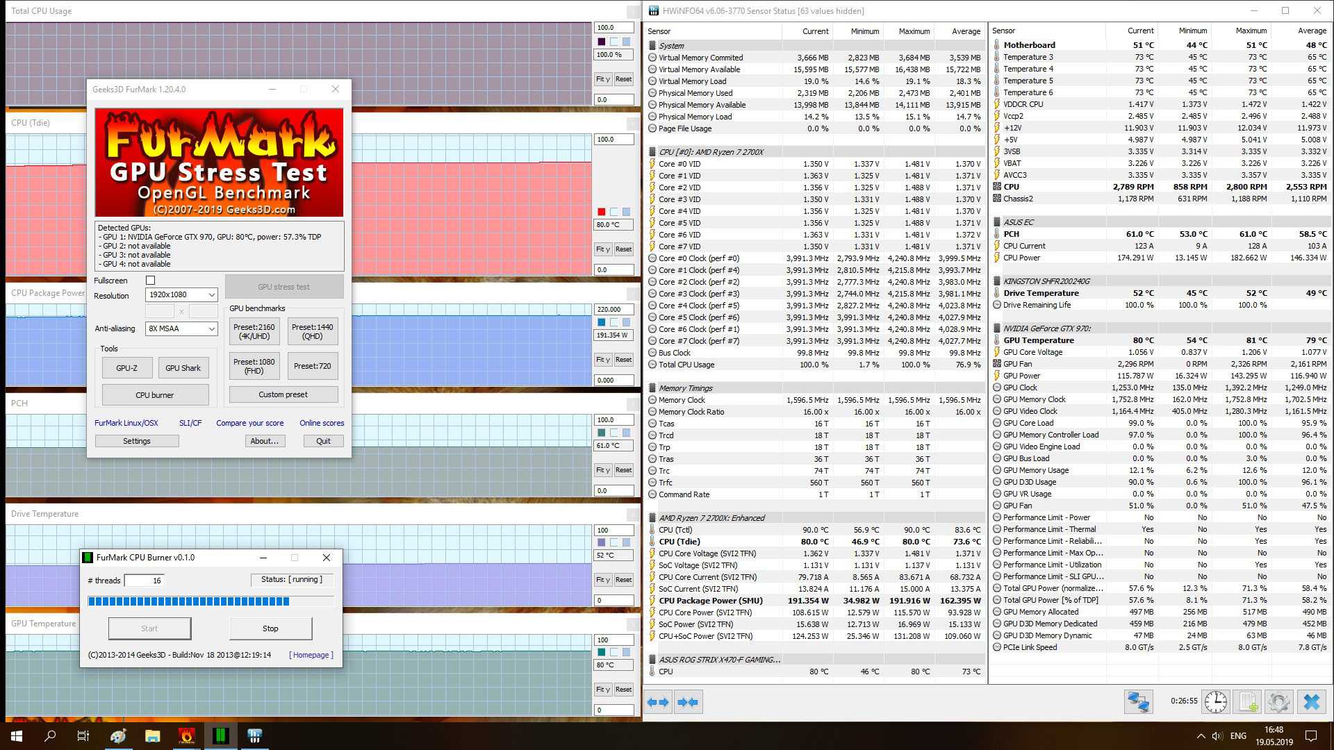 Показания сняты программой HWiNFO64 6.06 в режиме бездействия ПК, а также при одновременной нагрузке на видеокарту с процессором посредством Furmark GPU Stress Test (1920×1080, 8xMSAA) и Furmark CPU Burner 0.1.0 (16 потоков).