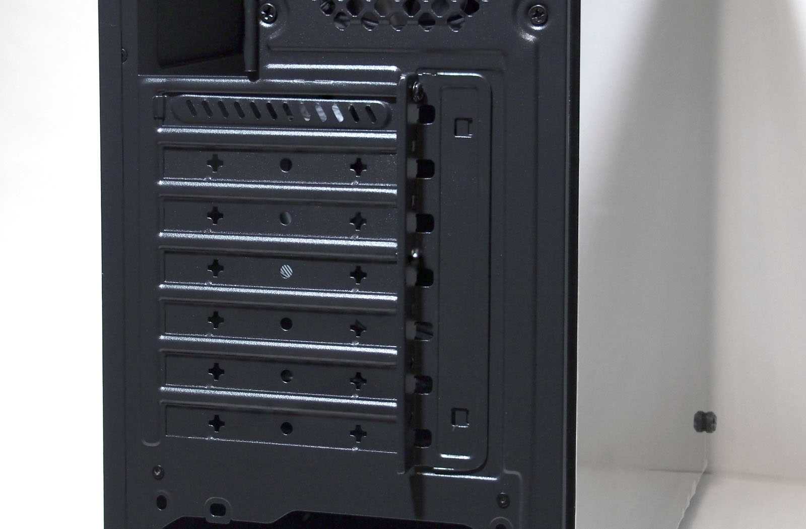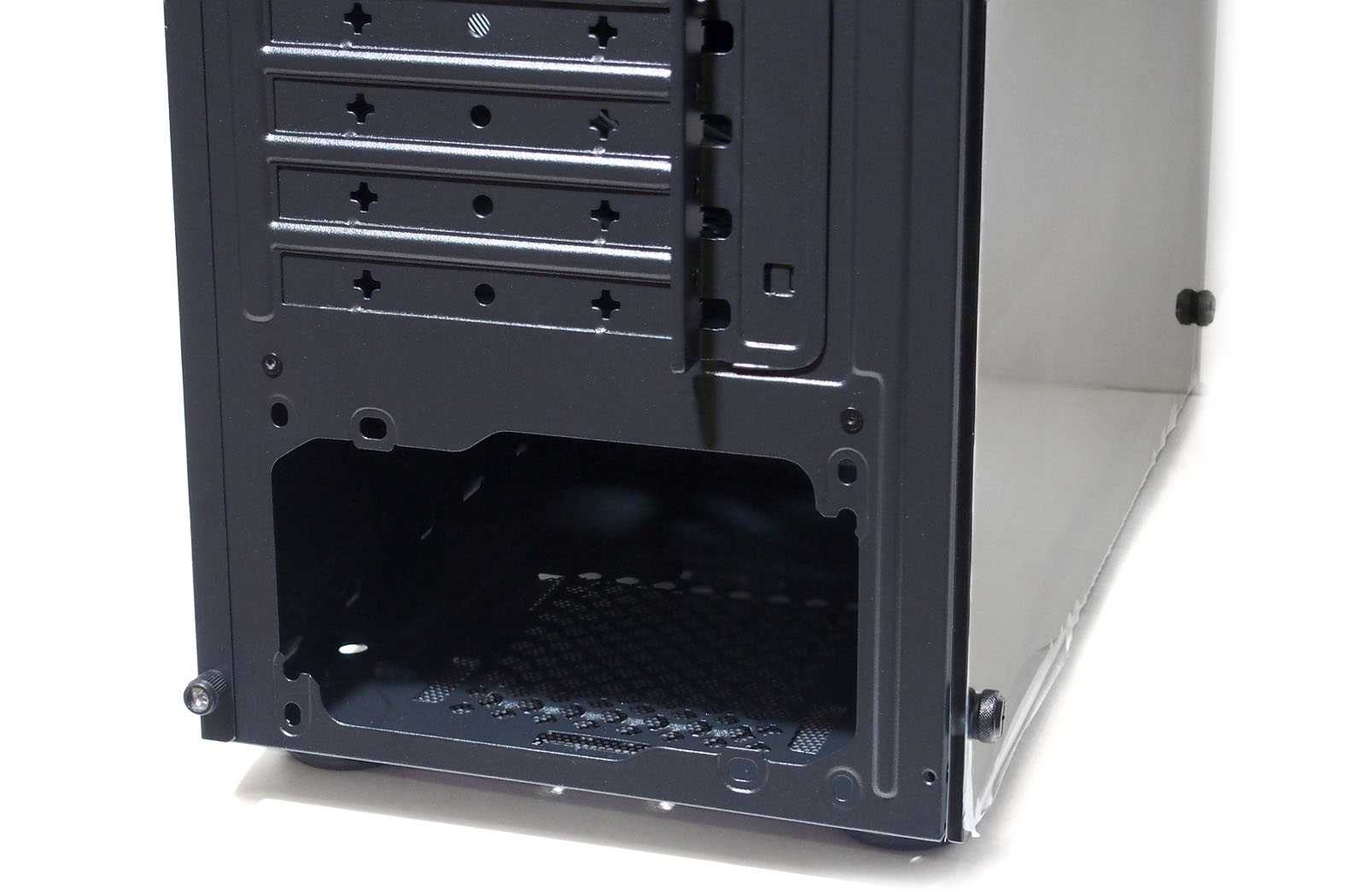 Место под блок питания официально предусматривает установку экземпляров до 180 мм глубиной, но на практике блоки длиннее 170 см вместить тяжело, так как проводами они упираются в несъемную корзину для накопителей информации. Для наиболее распространенных моделей мощностью до 750 Вт остается свободное пространство, чтобы спрятать излишки кабелей. Заготовленные отверстия на задней стенке позволяют прикрутить блок питания как вниз, так и вверх вентилятором. При ориентации вверх между корпусом БП и перегородкой отсеков есть расстояние, гарантирующее нормальный забор воздуха.