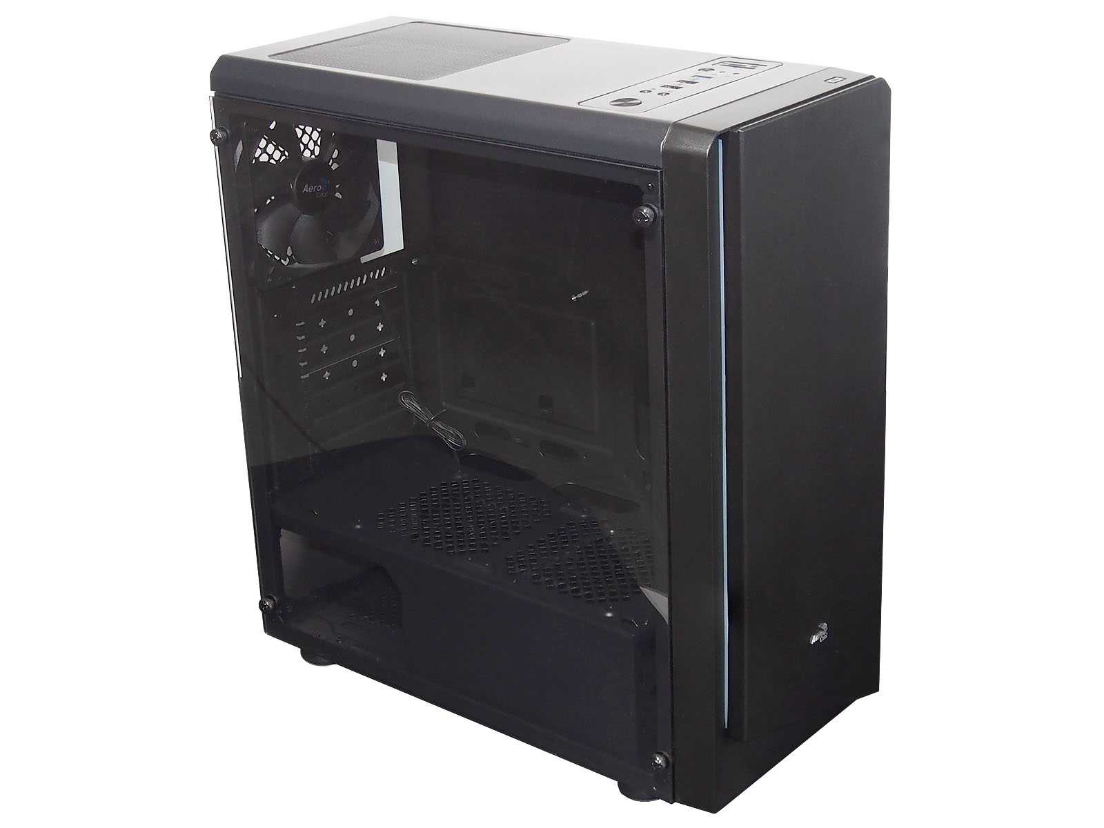 Корпус Aerocool Rift BG по габаритам относится к сегменту Middle Tower (средняя башня). В целом он некрупных размеров, даже для своего класса. Ширина — 19,5 см, глубина — 46,1 см и высота — 41,1 см. Шасси стальное, но толщина металла небольшая — 0,5 мм, что типично для «бюджетников». Визуально оно напоминает каркас смежной модели — Aerocool Cylon. Передняя панель Rift BG пластиковая. В совокупности общий вес корпуса составляет чуть менее 4 кг.